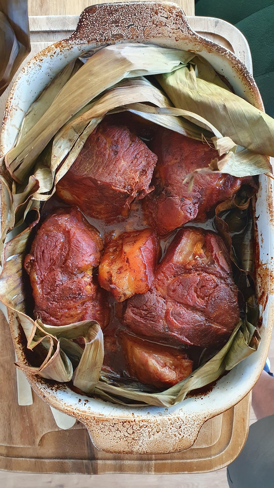 Used Boston Butt and small pieces of belly fat for the extra flavours. Marinated overnight in a mix or orange juice, black pepper, allspice, garlic, orégano, salt, a dash of pimentón de la Vera and achiote paste.