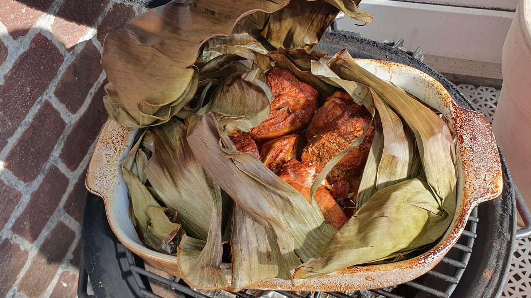 Before placing the meat on the fire I rinsed and ran through the stove fire banana leaves that zo used to line the dish and covered also the top of the meat before placing it in the kamado. Then proceeded to cook it at 210 f° for about 6 hours. When it was ready to break down I pulled the meat and let it in another half an hour before removing. It's a thing of beauty!