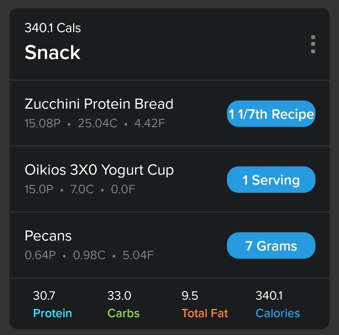 Afternoon Snack: protein zucchini bread, I added pecans to this batch. Side yogurt cup.