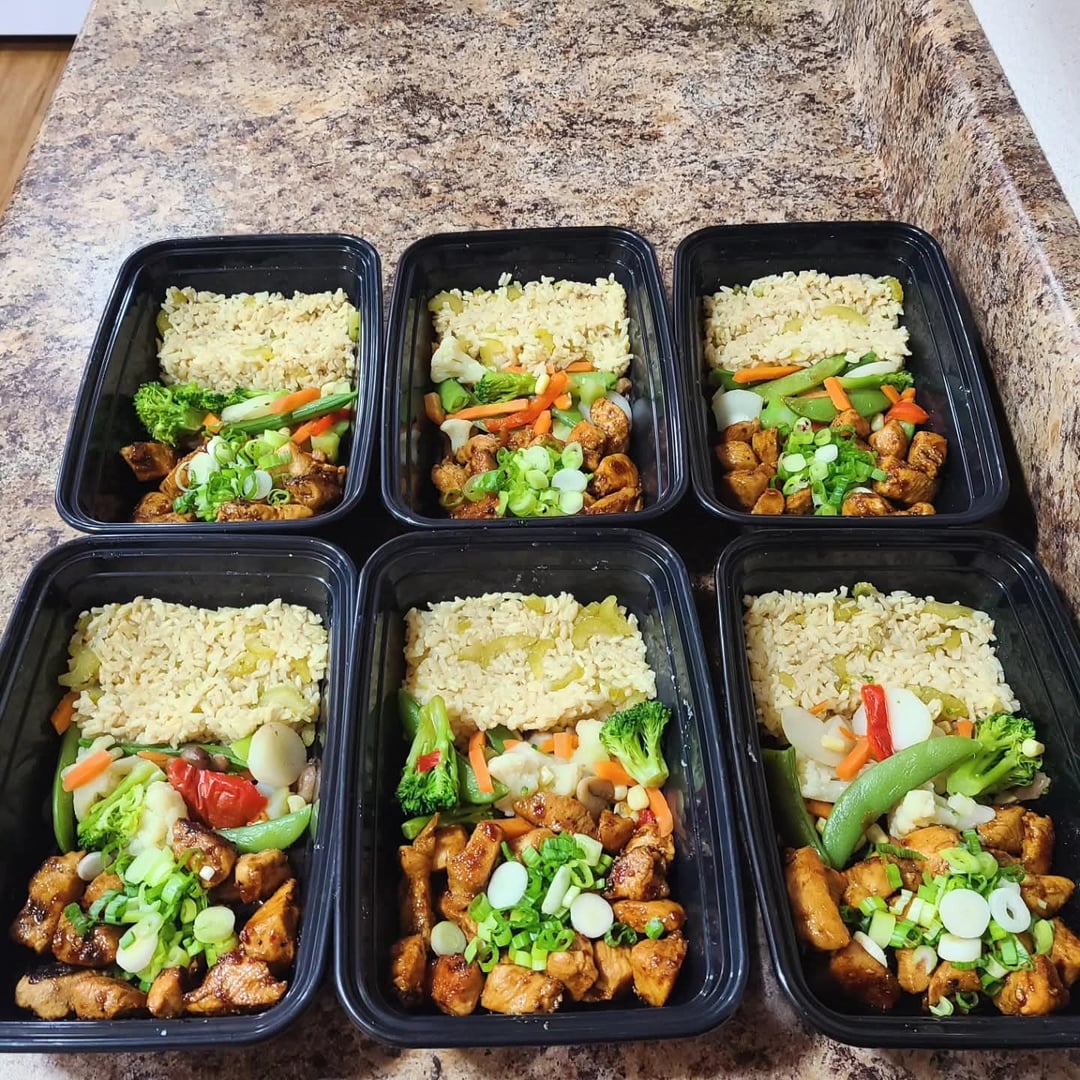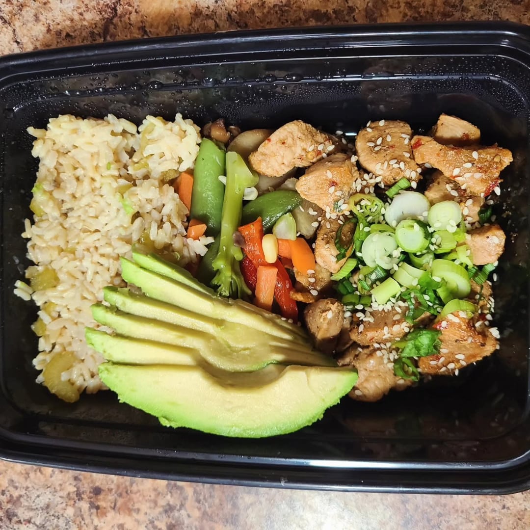 Dinners: sesame chicken, steamed mixed veggies, brown rice. Garnish with scallions, avocado and sesame seeds. I based my chicken from this recipe: