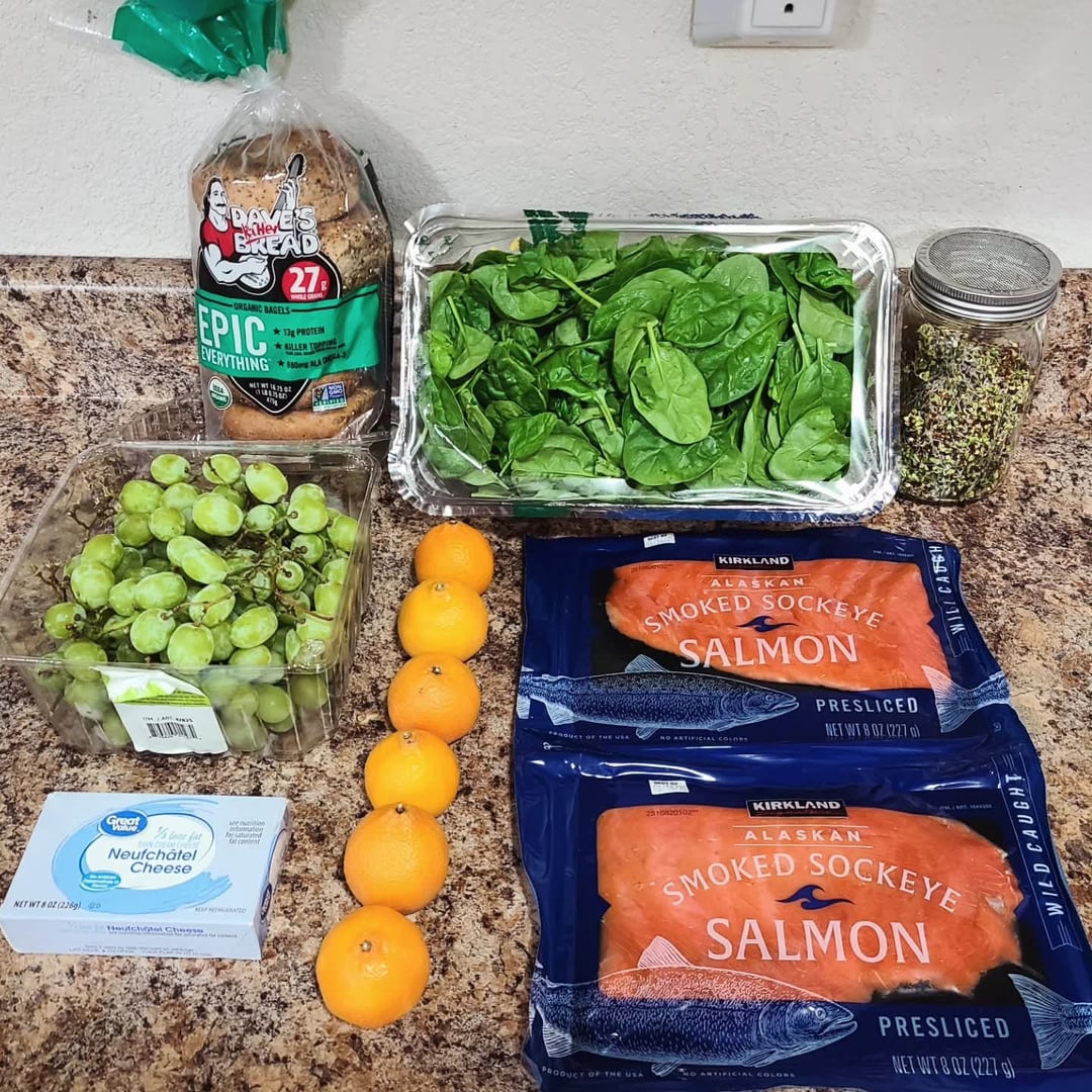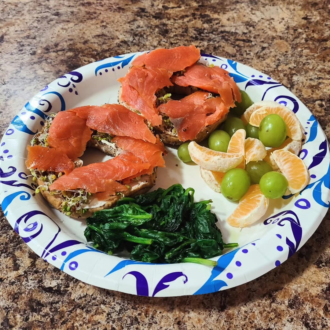 Breakfasts: Everything bagel with neufchatel, homegrown broccoli sprouts and smoked salmon. Steamed spinach, green grapes and a Mandarin orange.