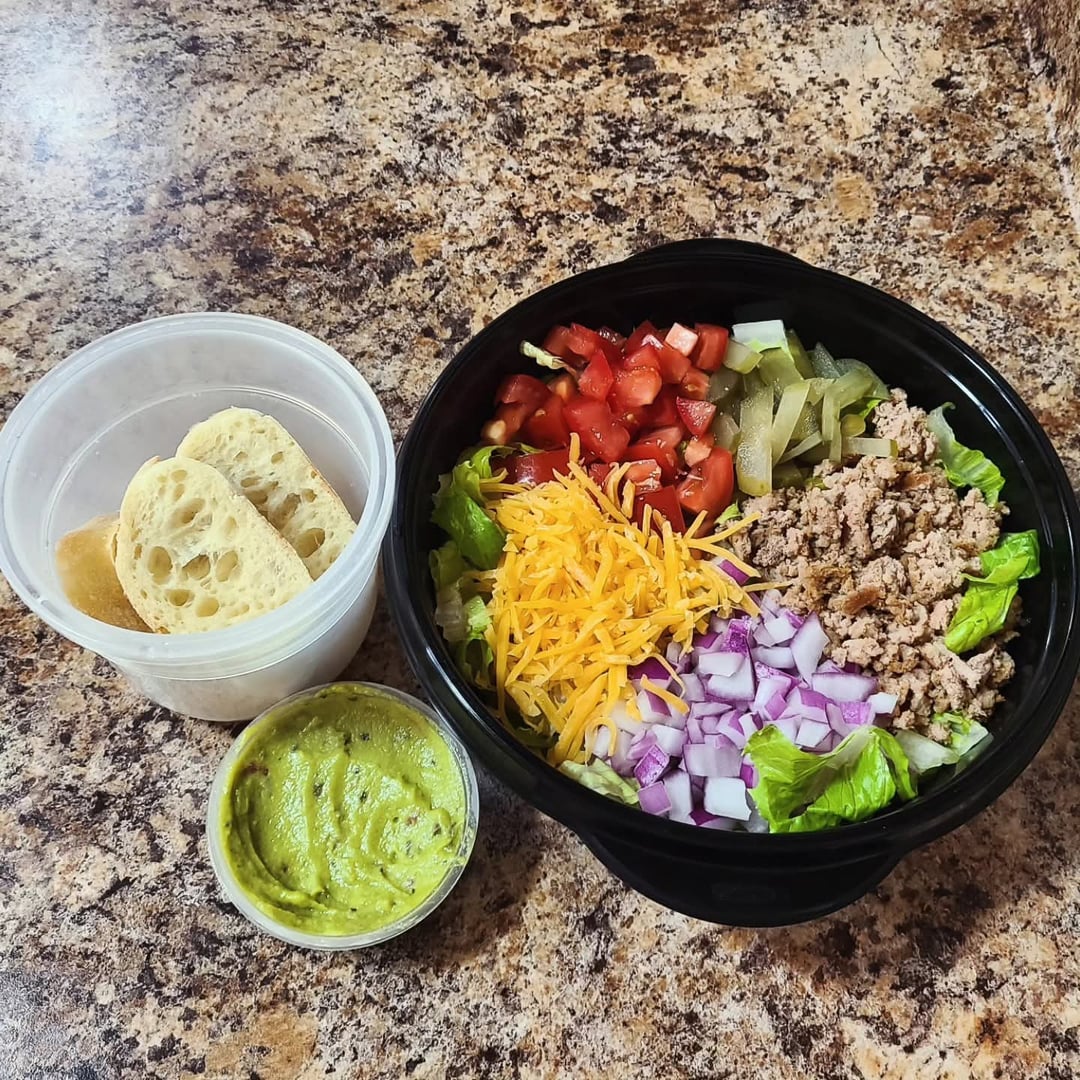 Cheeseburger lunch salads: Romaine lettuce, fat-free shredded cheddar, diced red onion, tomato, pickles, 93/7 lean ground turkey. Guacamole cup as dressing and a side of sliced bread.