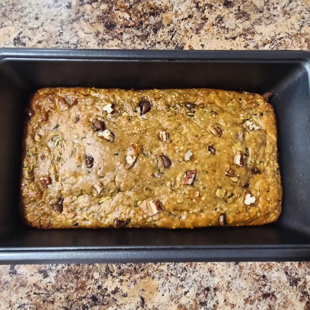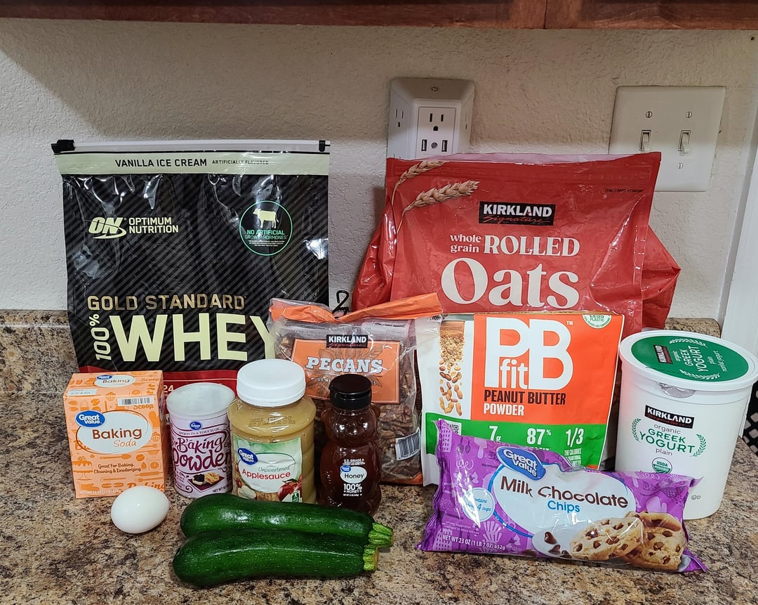 My Recipe: 123g old-fashioned oats (1.5 cups), 66g Vanilla whey protein powder (2 scoops), 45g powdered Peanutbutter (3 Tbsp), 2.5g baking soda (1/2 tsp), 7g baking powder (1 1/2 tsp), dash of cinnamon, 5ml vanilla extract (1 tsp), 1 egg, 61g unsweetened applesauce (1/4 cup), 40g honey (2 Tbsp), 56g plain fat-free Greek yogurt (1/4 cup), 300g shredded zucchini (1 large), 30g chocolate chips (2 Tbsp), 50g chopped pecans (1/3 cup).