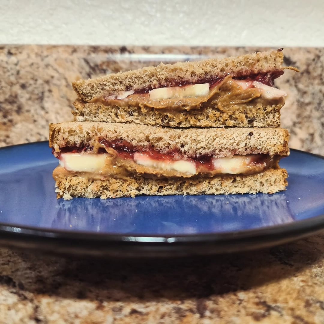 Bodybuilding PB & J Snack: PB Fit, vanilla whey protein powder, peanutbutter mixed with water. Raspberry jam and sliced banana on multigrain bread.