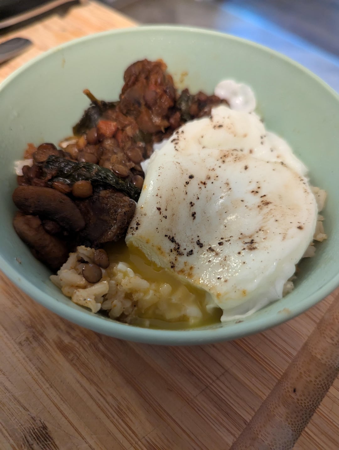 Lunch: Brown rice and spiced lentils and greens with a poached egg