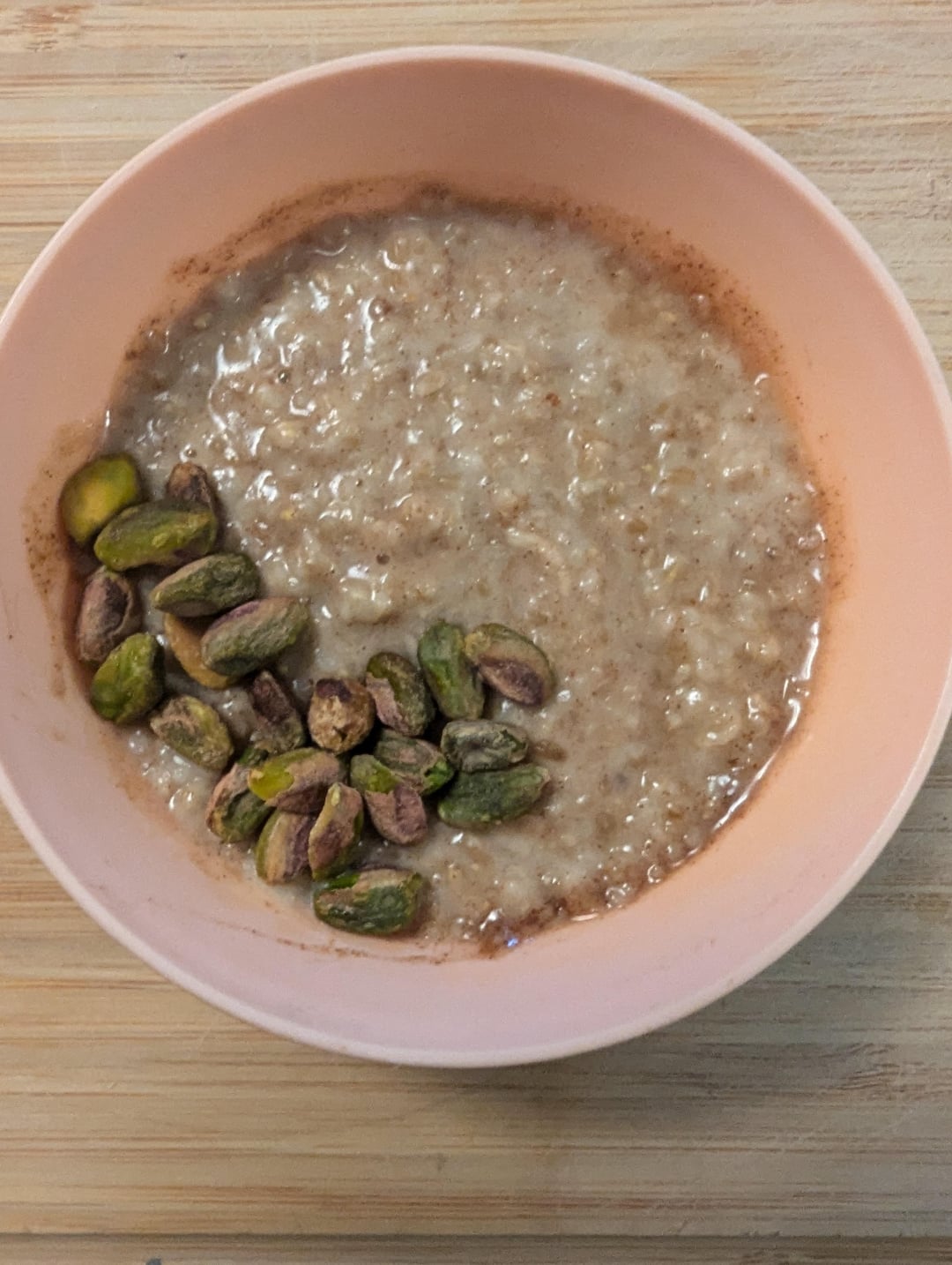 Breakfast: Steel-cut oats with cinnamon, maple syrup, and pistachios