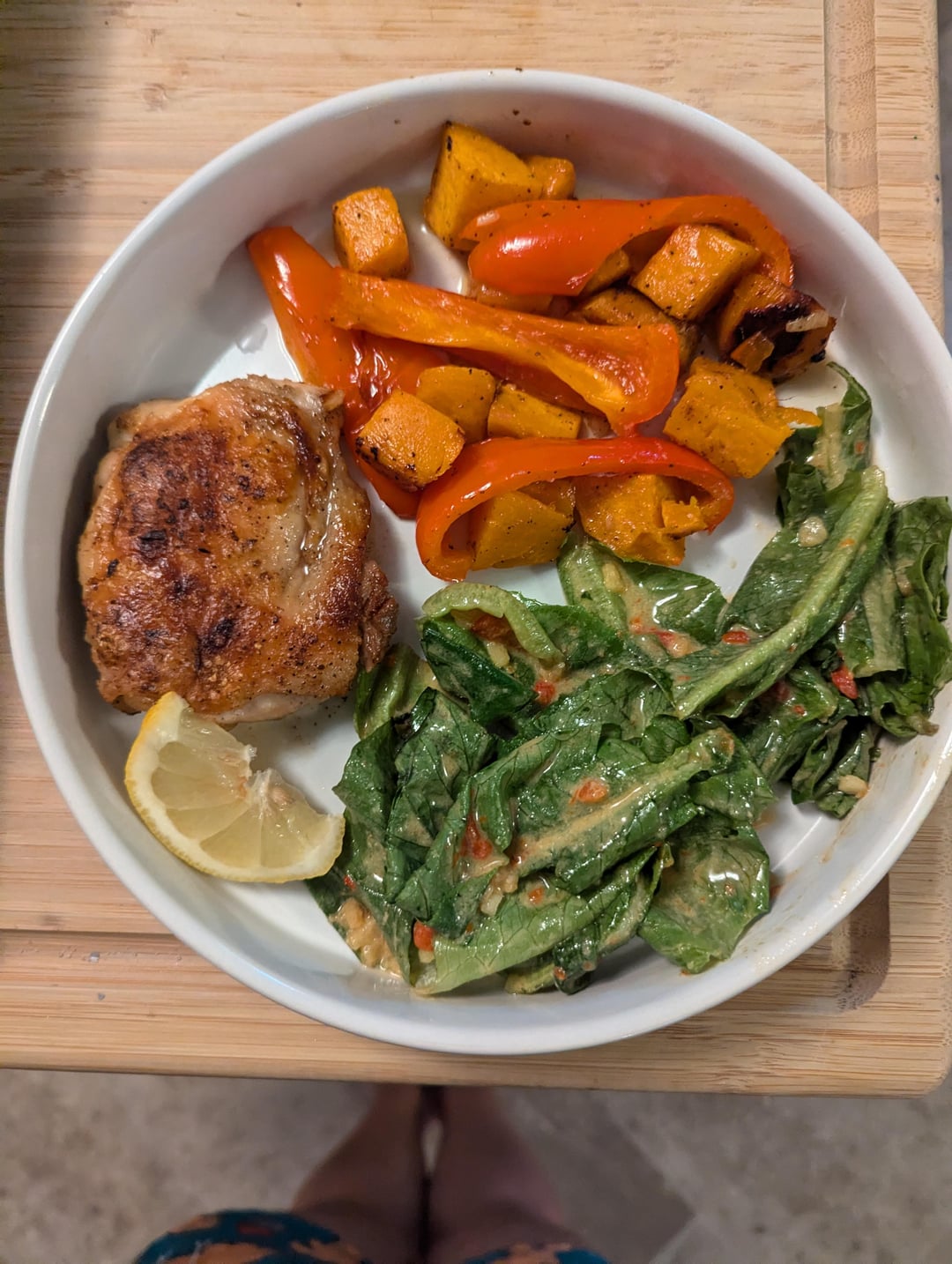 Dinner: Sheet pan lemon chicken, sweet potatoes, red pepper, and green salad with Dijon vinaigrette
