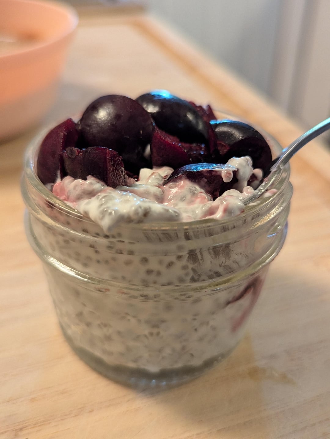 Snack: Coconut yogurt chia pudding with fresh cherries