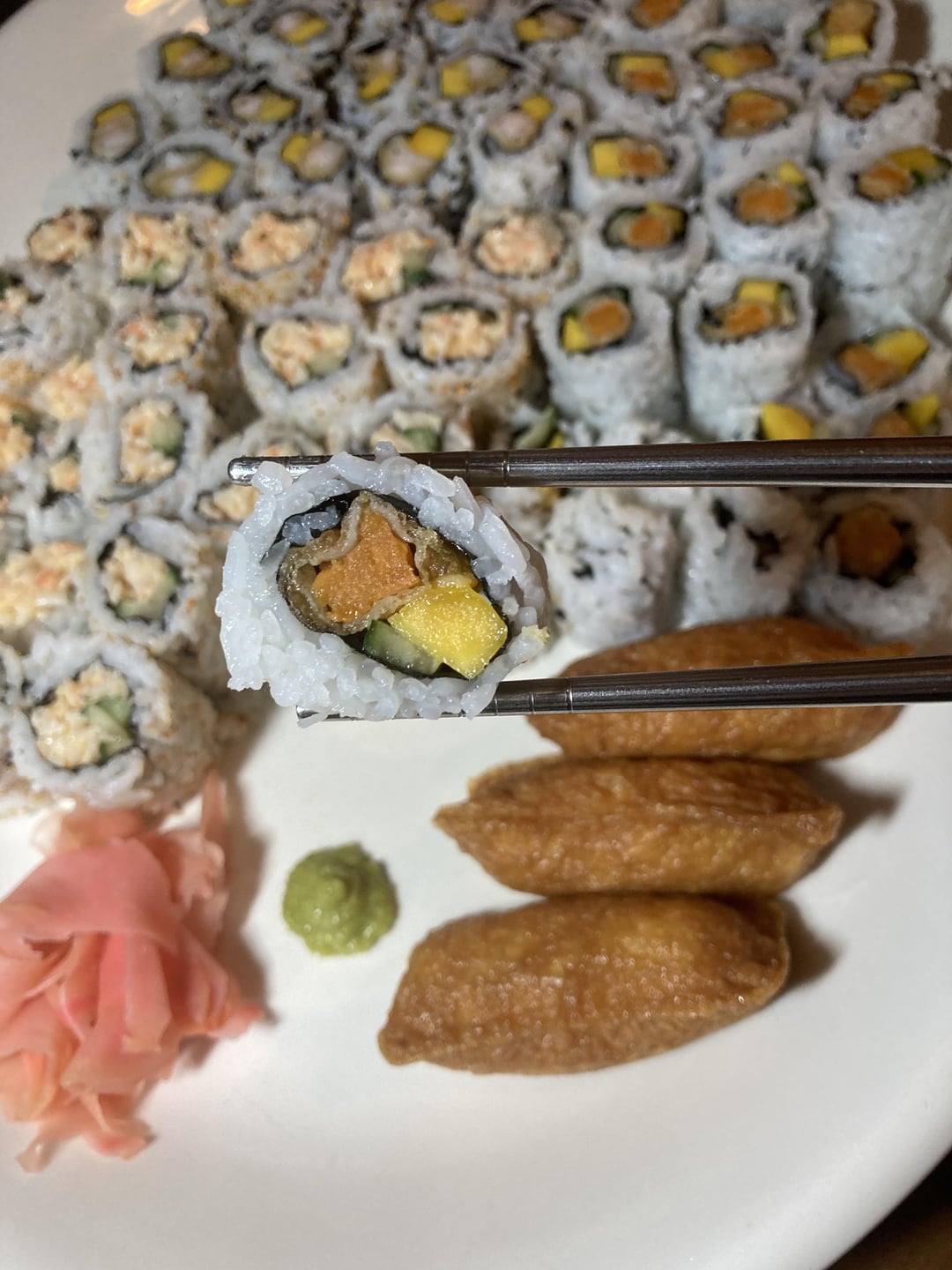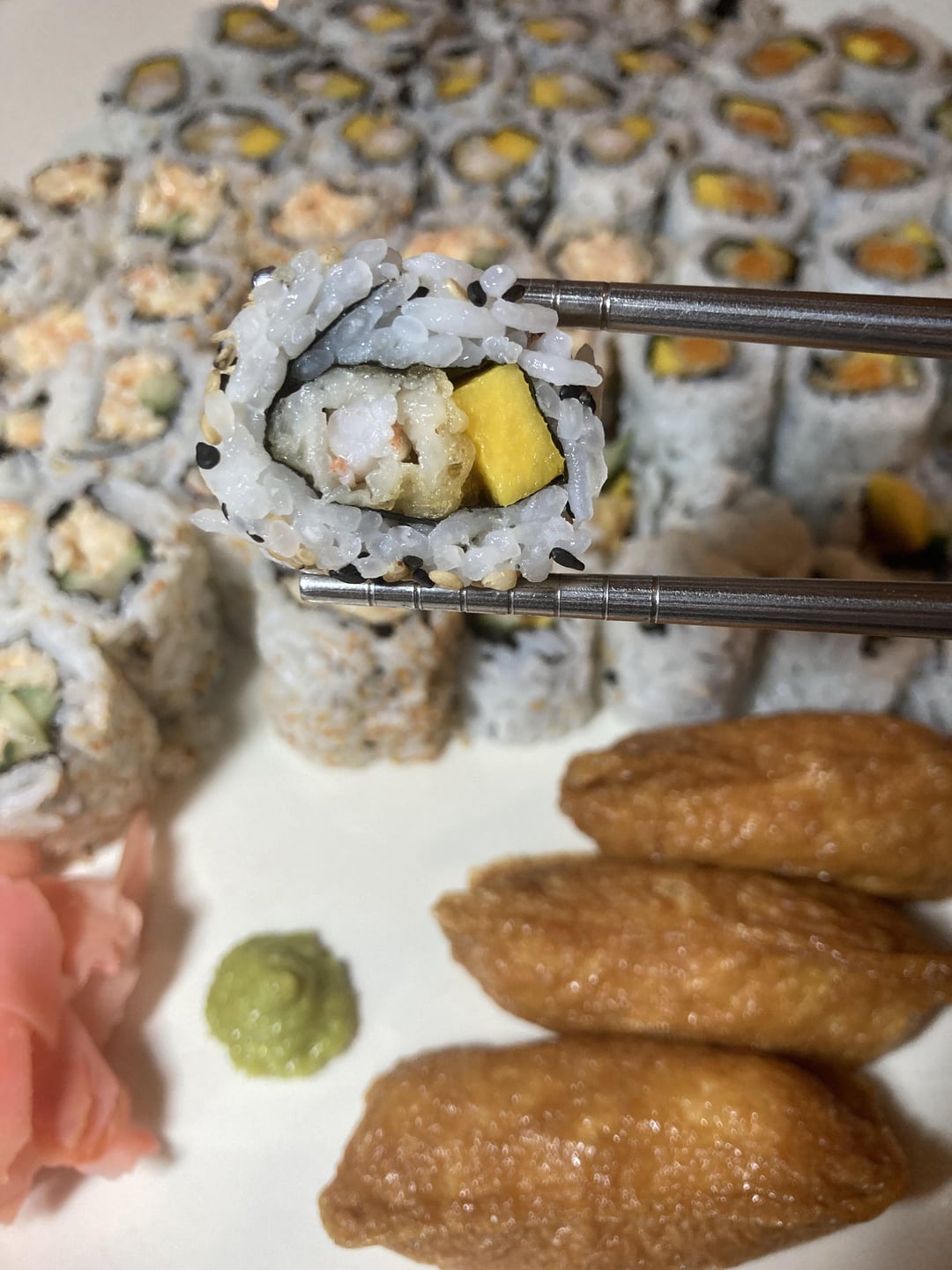 The rolls are spicy imitation crab and cucumber, shrimp tempura and mango, & sweet potato tempura, cucumber and mango. I also have a few inari nigiri.