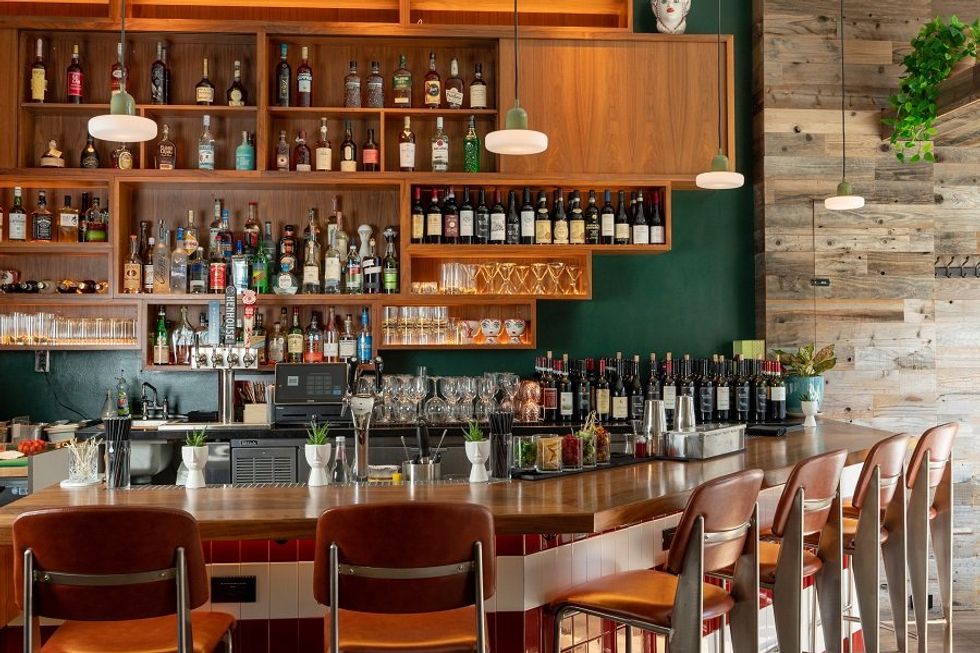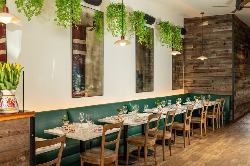 The dishware, chalice included, is a sweet bespoke detail that brings a bit of hand-painted color and whimsy to the restaurant’s classic style. A forest green banquet runs the length of the restaurant under cascades of vines in the front lounge and a collage of vintage Italian spirit and food advertisements in the back. The half-moon bar at the entrance, with its polished wood shelving and red-and-white tile, lend the space a mid-century European vibe.