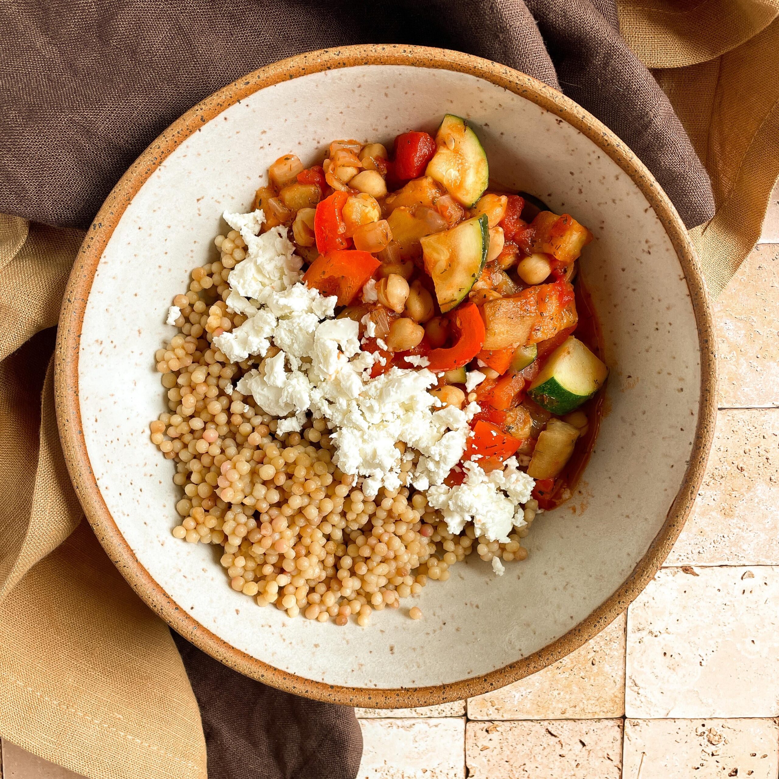 This has always been a big favorite of mine so I was surprised to see that, according to my recipe app, I hadn’t made it since 2015. It’s definitely a good one for the MD, basically all veg. I think it was originally a Cooking Light recipe that I’ve slightly adapted, mainly adding chickpeas and subbing Parmesan for feta, and I generally play fast and loose with the ingredient amounts, which is why I end up with enough to feed an army when I only need enough for me. I used whole wheat Maftoul here, which is the Palestinian version of pearl couscous. The brand I used is made by a small Palestinian company based in the West Bank. I got the last box at my Whole Foods and unfortunately it looks like the company is sold out of it but hopefully they’ll have it again.