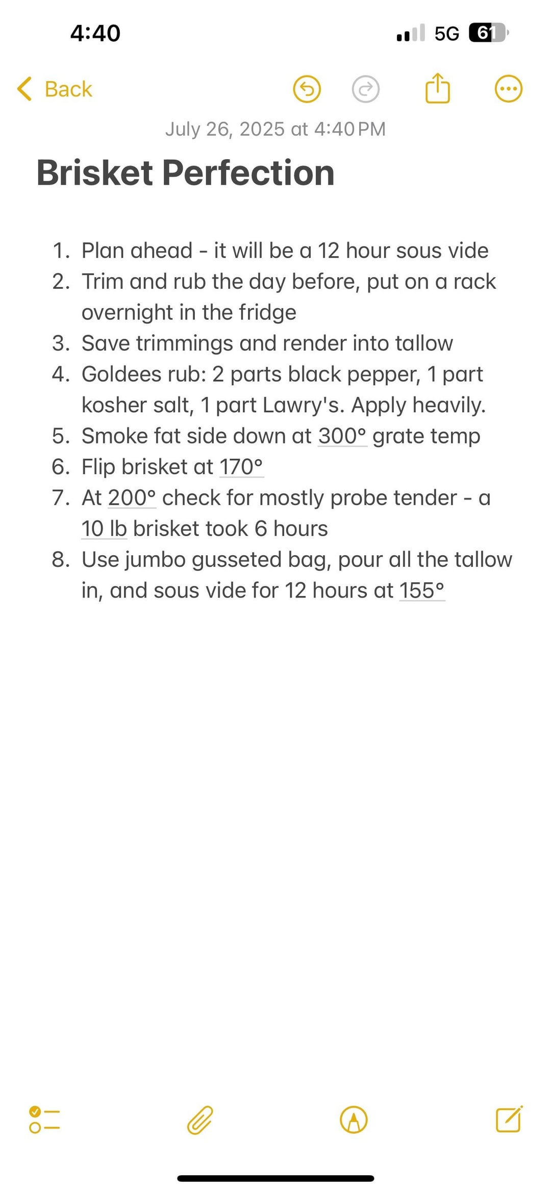 My brisket results over the last 20 years have been inconsistent. I finally made one that I am really pleased with, and hopefully have a method I can replicate in the future because I took notes on photo #5!