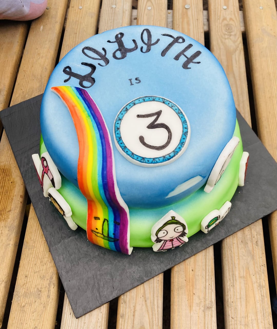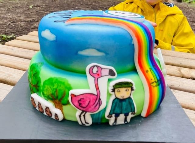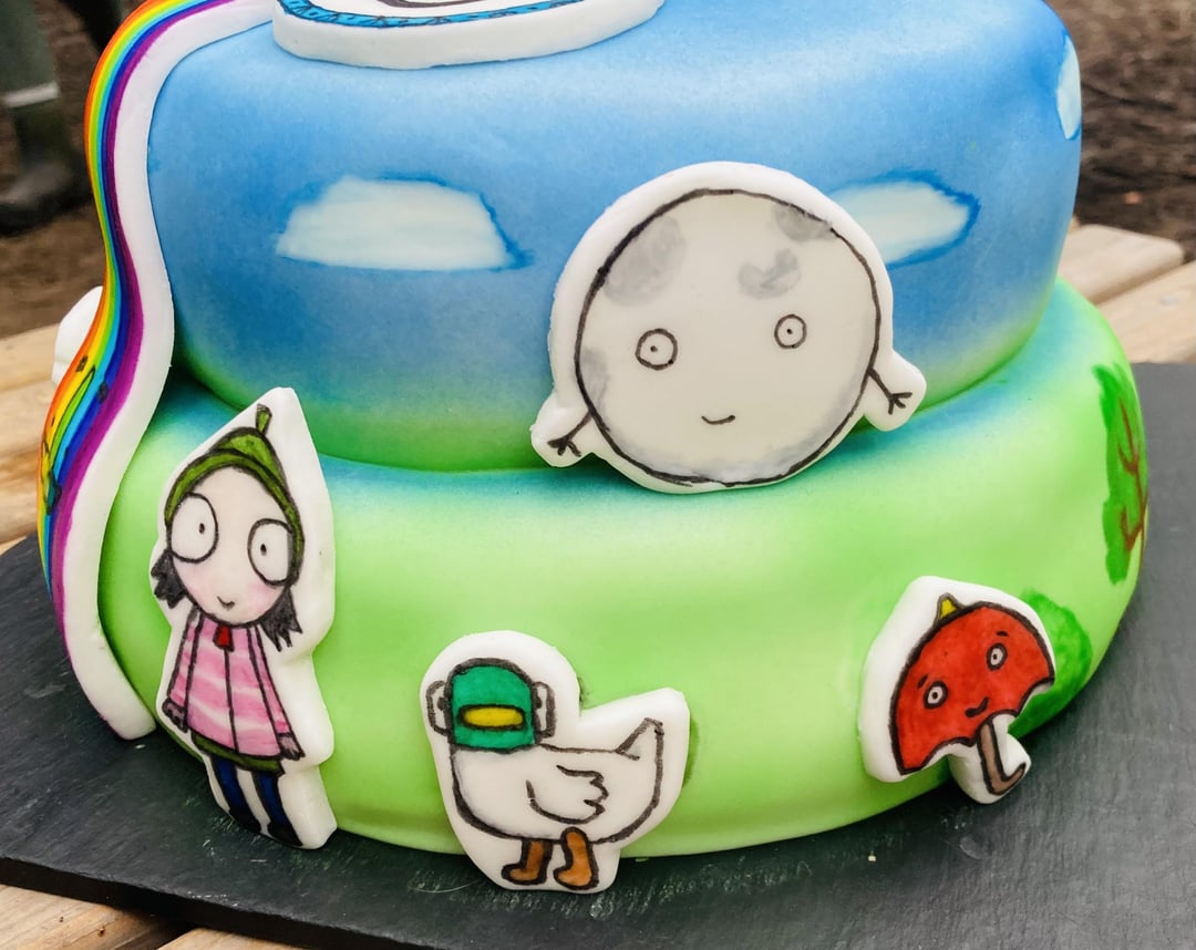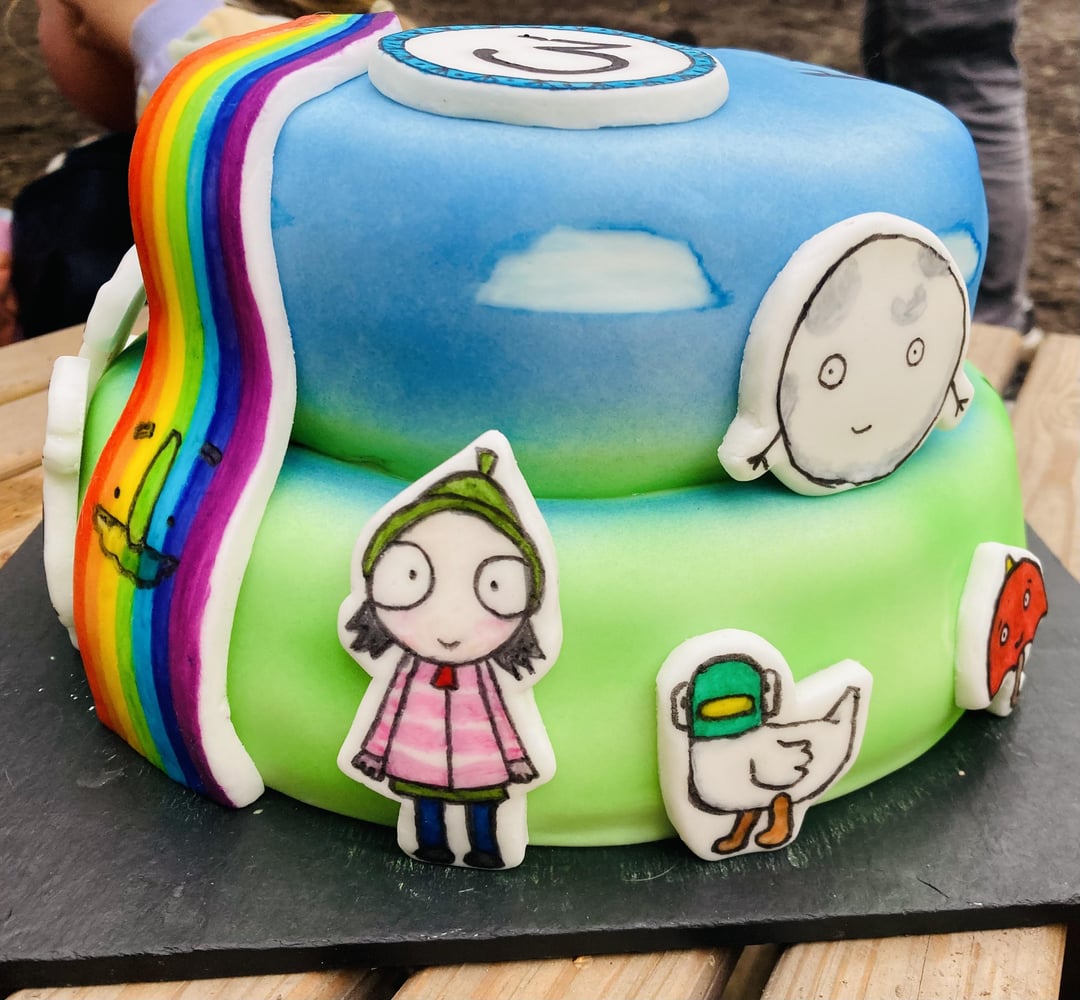 Vanilla Victoria sponge cake with buttercream icing and jam layering. Decorated with a few of her favourite hand painted Sarah and Duck fondant characters.