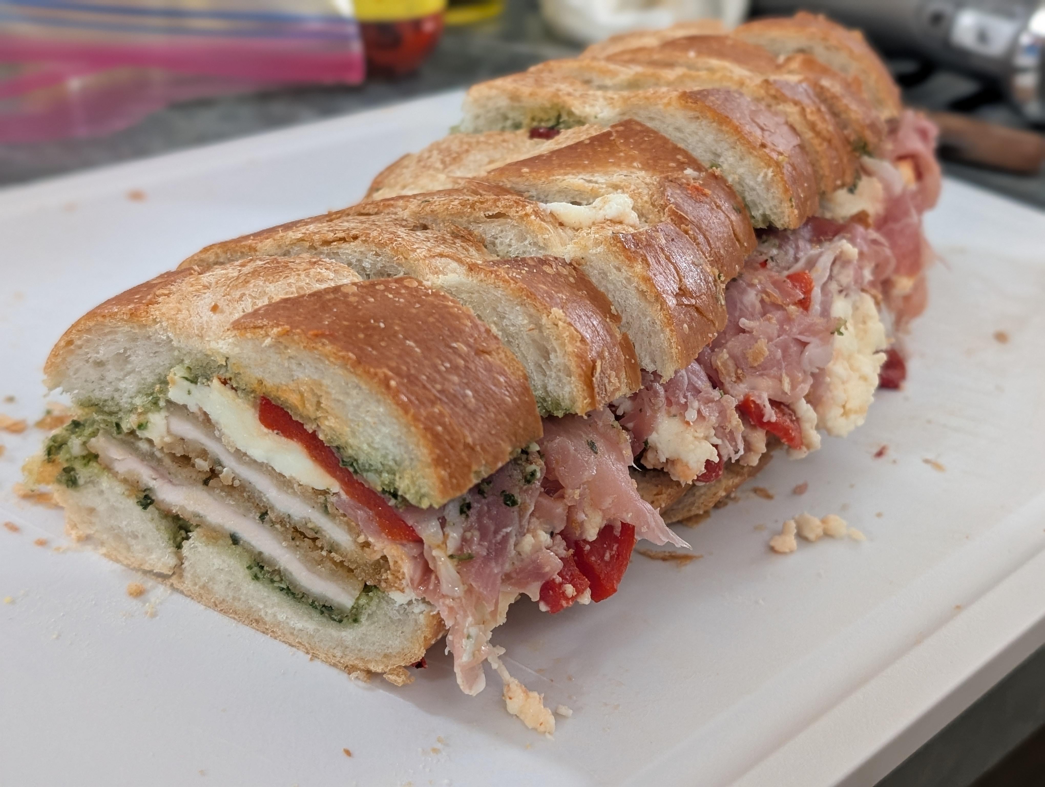 You slice it and bag it small so you don't contaminate with bait fingers! Garden fresh pesto, chicken cutlet, prosciutto, roasted red peppers, and fresh mozz. by onlywhileipoop 1 Comment slaxfib 4 months ago very nice i think my mouth would approach it from the side