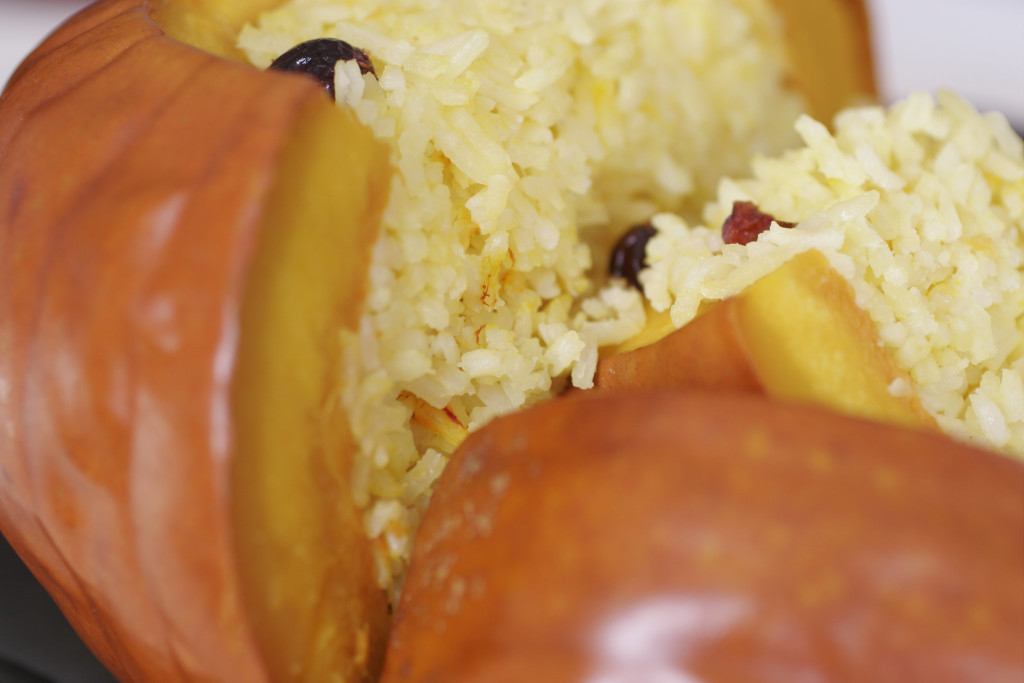 - In a large saucepan over medium-low heat, heat the oil, and sauté the onion until it is softened. Add 2 minced garlic cloves, and sauté for 30 seconds. Stir in the cranberries, ginger, allspice, saffron and orange zest. Add the rice, and stir until it is glossy. Pour in stock, and bring to a boil. Cover, and reduce heat as low as possible. Cook for 15 minutes. Meanwhile rub the inside of pumpkin with cut garlic clove, and rub with some salt to taste.