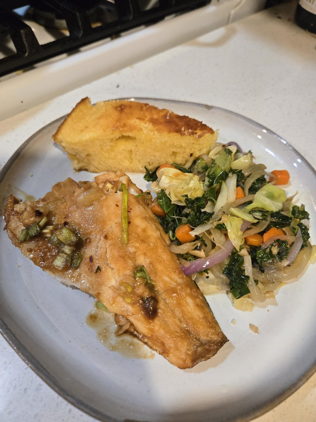 UnfairBalance510 9 months ago I meant regardless** of the comboThe cornbread, I used the recipe that on the side of the box of Albers cornmeal… (sweet cornbread)Cabbage/kale recipe is down below in a comment I answered.The sea bass I marinated in Soyaki sauce also from Trader Joe’s