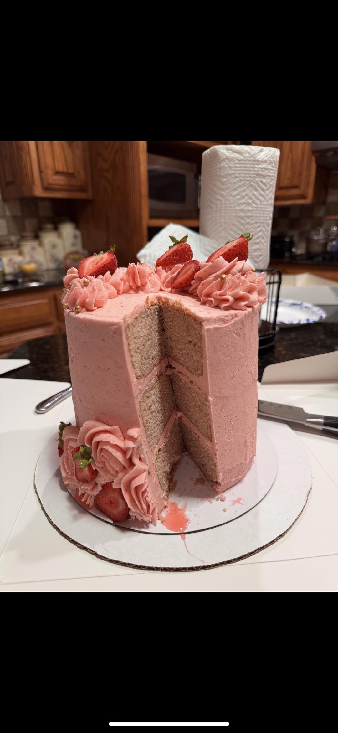 It’s a 6in strawberry cake that was made with a strawberry reduction, and strawberry buttercream that used blended freeze-dried strawberries 🍓🥰 by chaubacca23 20 Comments Poppyseedsky 9 months ago It’s super cute and looks nice mouthwatering 🤤 Individual-Line-5860 9 months ago It looks awesome! Love the inner layers. Big_Miss_Steak_ 9 months ago I am enjoying the cake to frosting ratio. Looks fab OP! Timely_Impress6223 9 months ago Looks delicious! Which cake flavor? MST3KGeek941 9 months ago Omg! Strawberry cake (with a cream cheese frosting) is my favorite. This one looks amazing! Well done OP. Vethetrucker 9 months ago Looks yummy 😋 raccafarian 9 months ago So pretty 🤩 love a slim& tall cake jltefend 9 months ago That looks amazing! Also, the person who cut that slice (very nicely and cleanly) might benefit from some PT/OT for their wrists and lower arms. MagnoliasandMums 9 months ago That’s 3 cakes ma’am 🤣And they look mouthwatering Annual-Education3230 9 months ago Very pretty and looks delicious💕 Minamu68 9 months ago Beautiful cake! redwoodcat55 9 months ago Yummm, give it to me 😍😍😍 LightBleuSky 9 months ago 😍😋😍 MackCLE 9 months ago Perfection. Strawberry is a favorite. Capital-Eggplant-177 9 months ago Very pretty! 😍 trussmegirl 9 months ago 🤤 NewbieMaleStr8isBack 9 months ago Beautiful kbiittner 9 months ago Lovely! You’ve achieved a really lovely shade and it looks delicious. Interesting_Lie3717 9 months ago So lovely!! pam-jones 9 months ago It’s beautiful and it looks like it will be really yummy!!