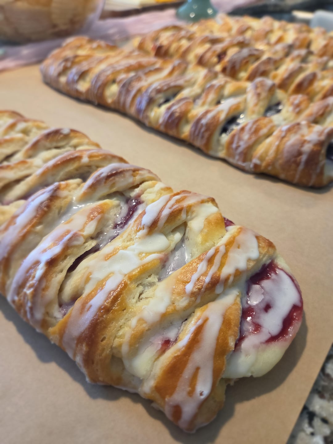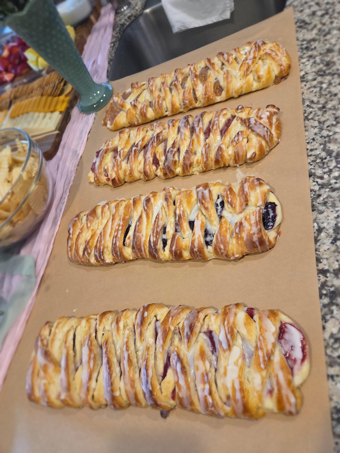Made 4 cream cheese pastry braids. Original recipe modified from sallysbakingaddiction. Peach, strawberry, raspberry and blueberry. Made for a wedding shower