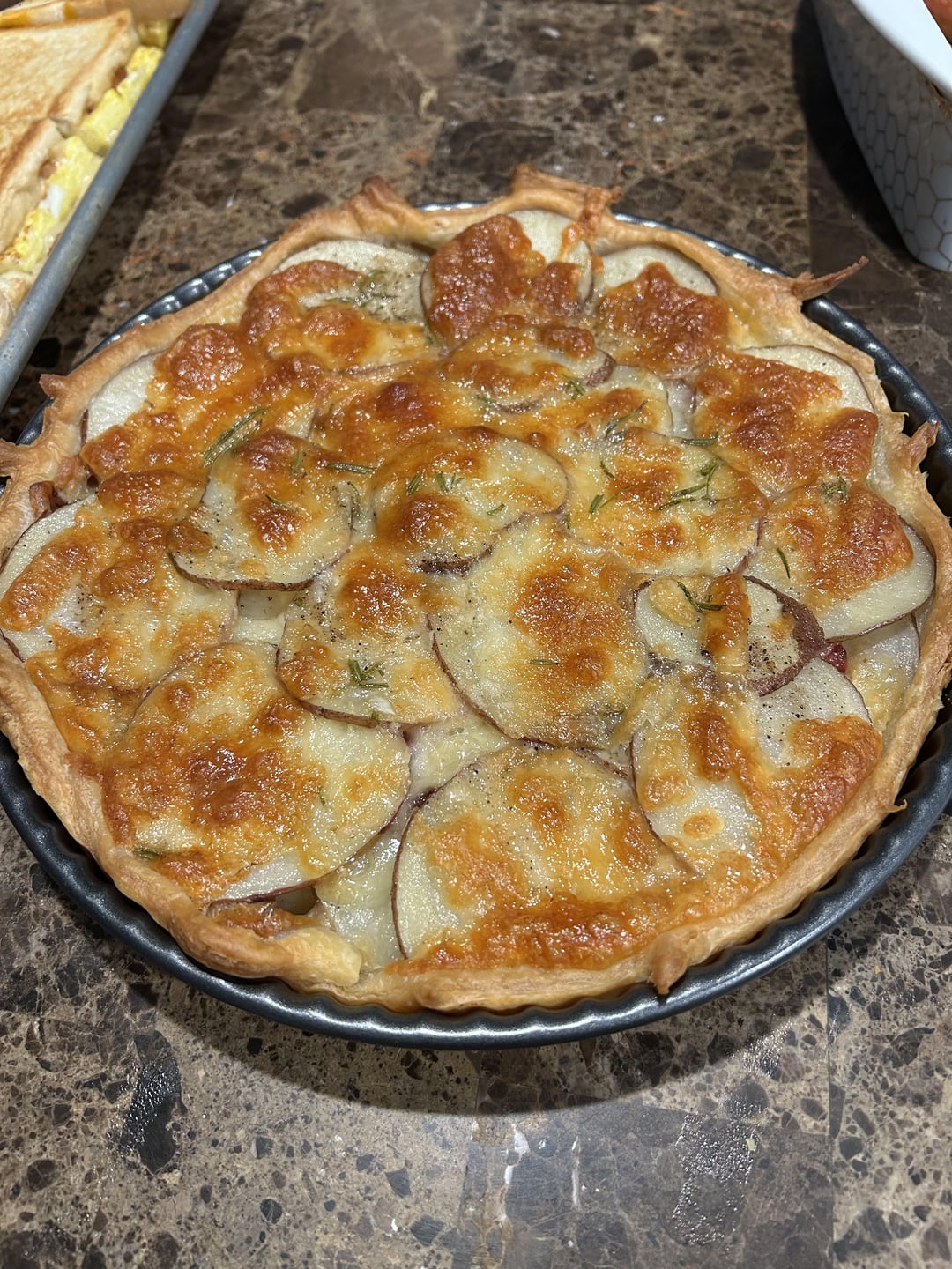 Potato Tart: potato, Gruyere, bacon and rosemary with fruit.