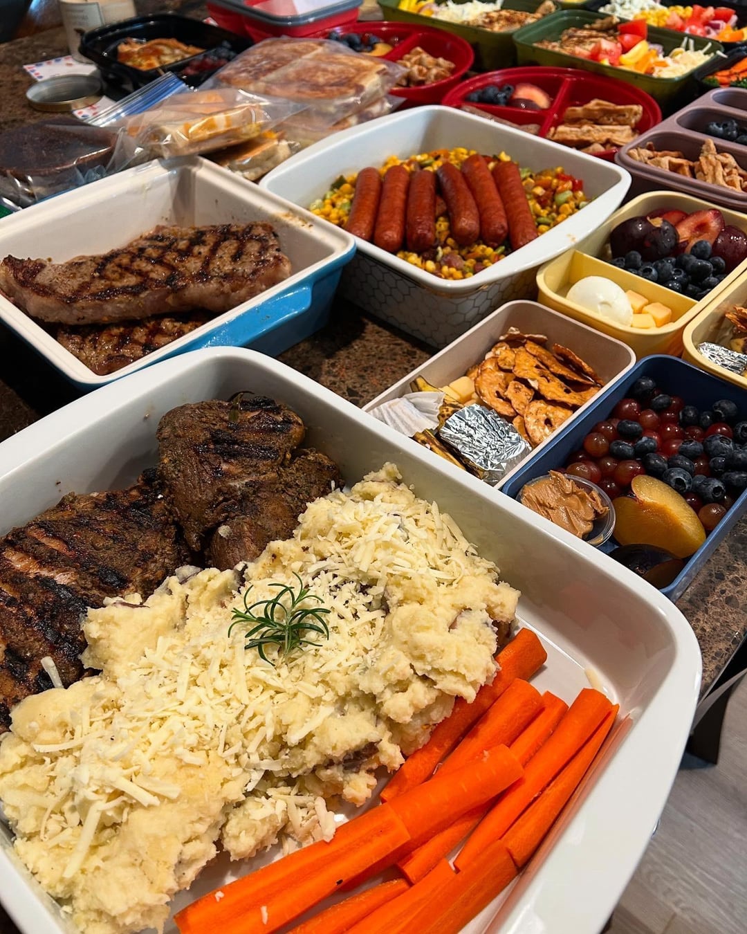 Steak salad: chopped kale, radicchio, romaine, corn, tomatoes, blue cheese, peppers. Steaks are separate and will be sliced when it’s time to eat.