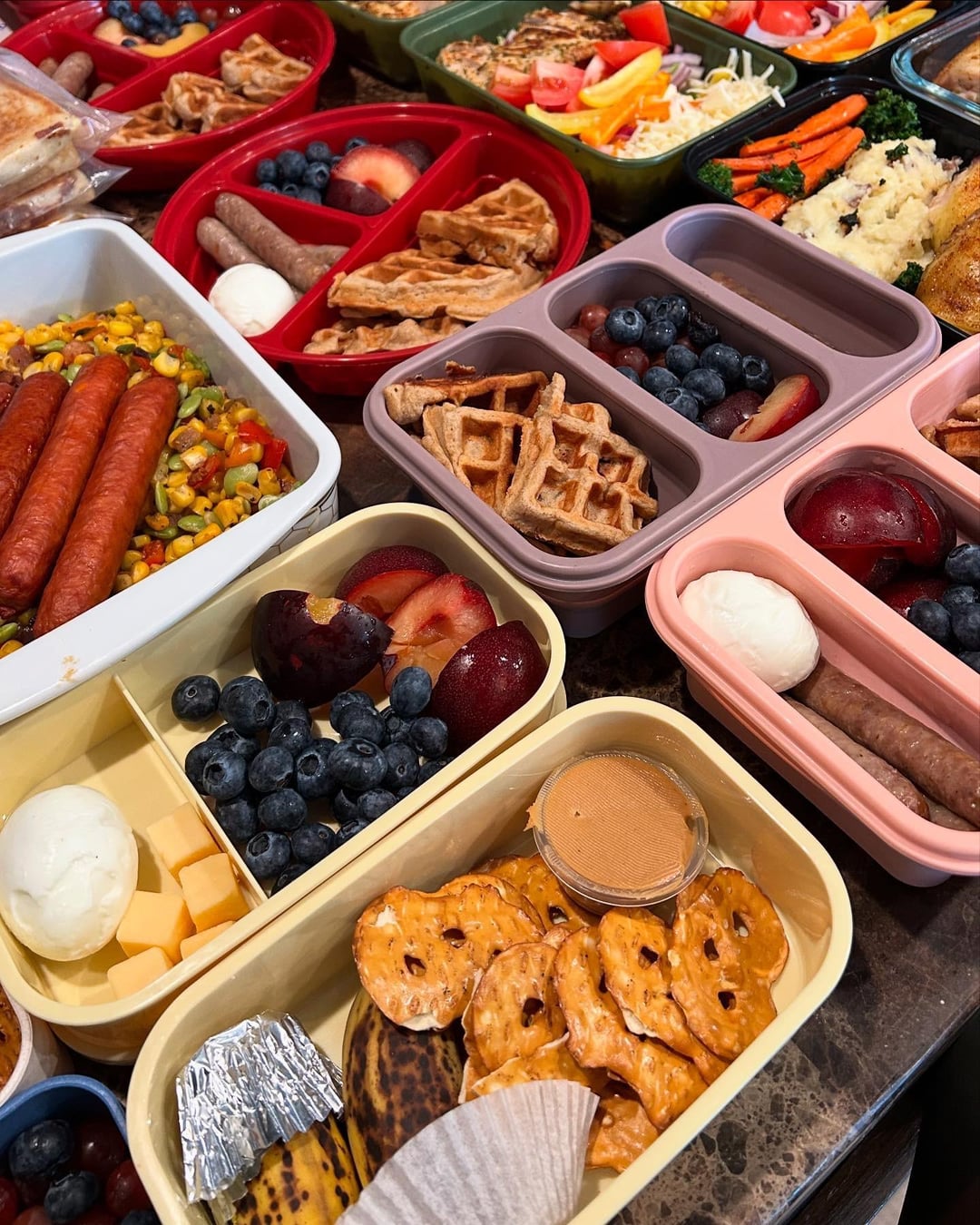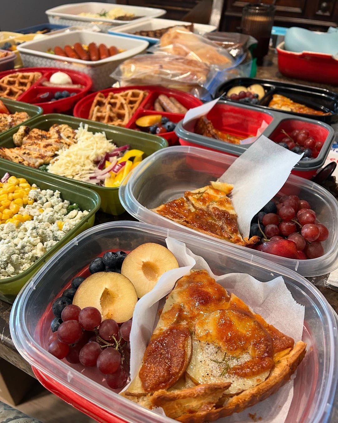 Waffle box: banana protein waffles, sausage, hard boiled egg, grapes, plums and blueberries