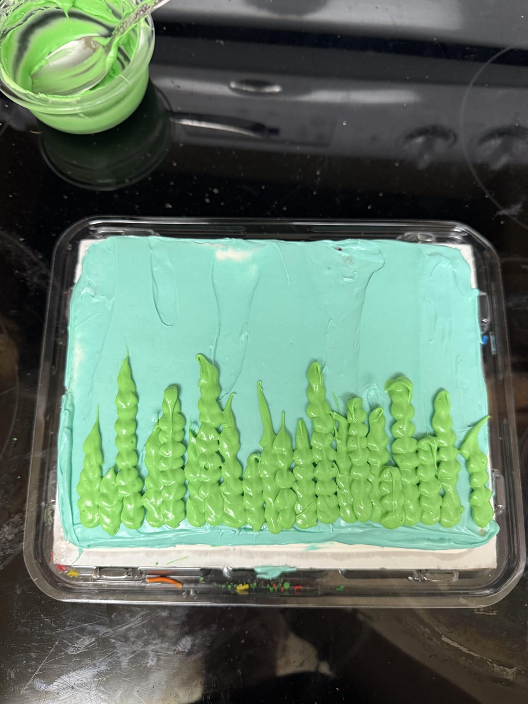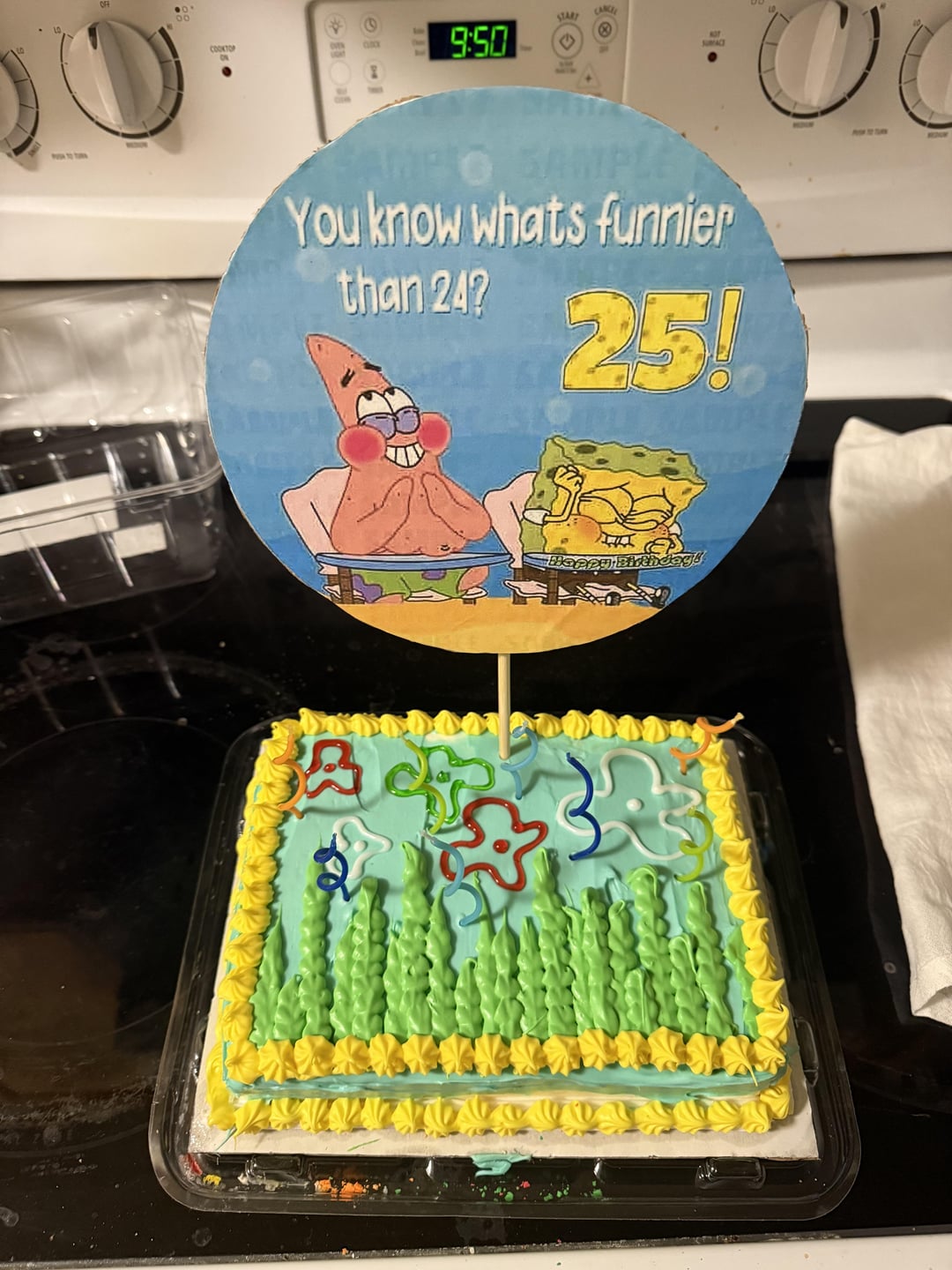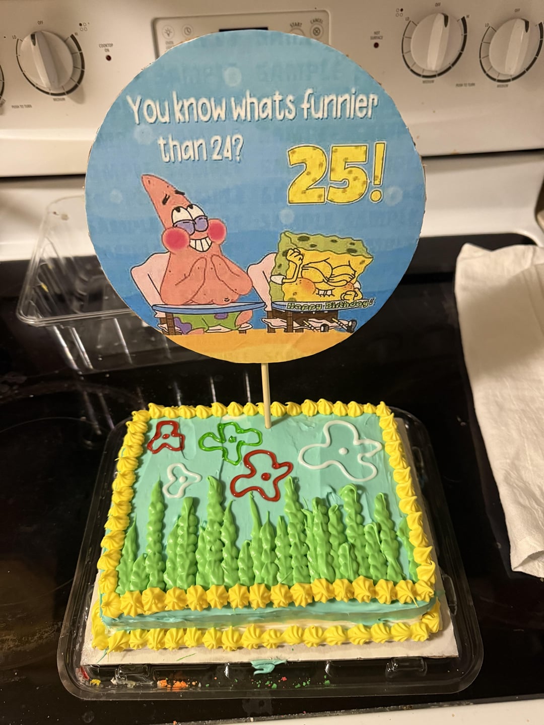 I realized a little too late that I wanted a “special” cake for his 25th birthday and no one was available to decorate before the big day. I bought this cake at Walmart and scraped off the icing on top and put my own decorations!! I’m no professional by any means, but I’m very proud of the way it turned out! Haha