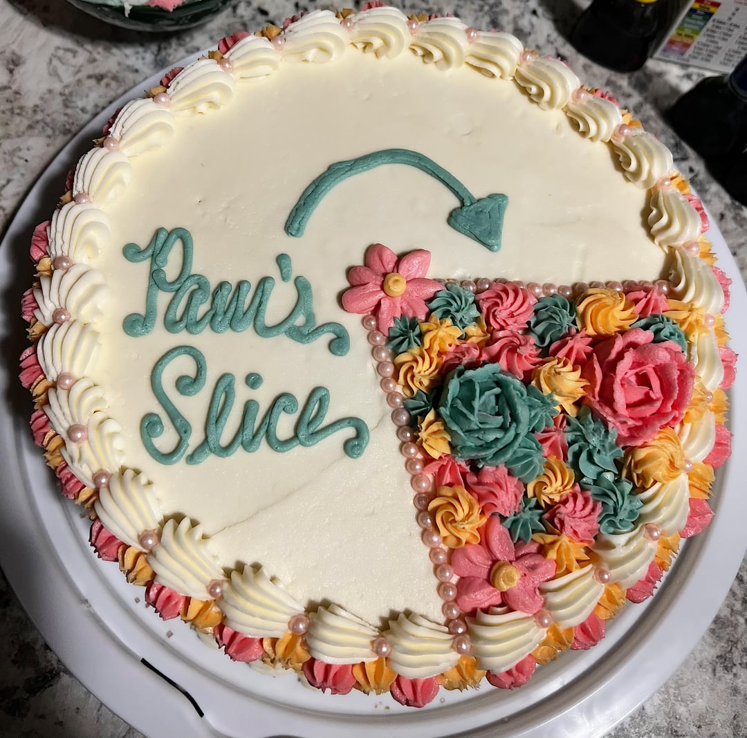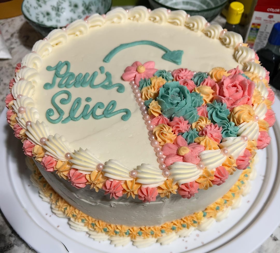 If it’s my birthday the whole cake is mine, so I only see one flaw with this… invert it. Full flowers everywhere then one blank slice that says “pink’s slice” pointing out to the REST of the cake.