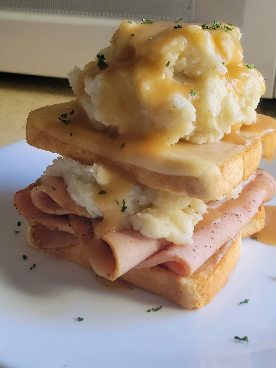 When I have a bunch of smoked turkey lunch meat and swiss I always make this. You better believe after Thanksgiving this meat is all left over turkey, but until then this scratches the itch. The bread is toasted lightly, layered with melted swiss cheese, glob of potatoes in the middle, gravy, potatoes on top and smothered in gravy again. It stands about 10" high.