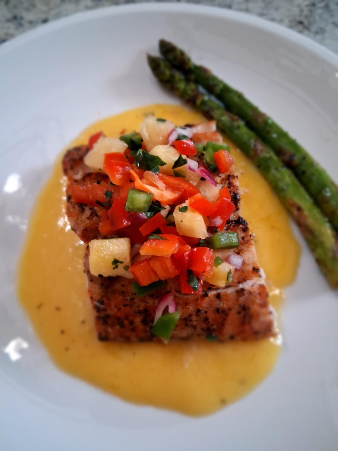 Grilled mahi mahi over mango butter topped with pineapple salsa with a side of lemon pepper asparagus π