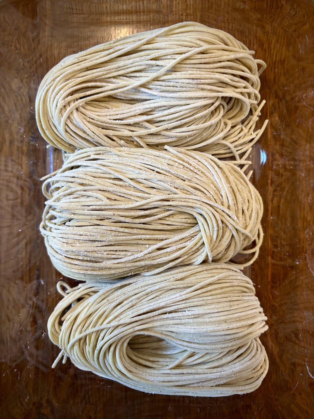 66g noodle flour 25 AP flour 5g tapioca starch 3g toasted rye 1g vital wheat gluten35ml h20 1g salt 1g sodium carbonate1.5mm cut by _reamen_ 2 Comments BreakfastPizzaStudio 9 months ago Gorgeous work.How would you describe the contribution of rye flour? I’d love to hear about it! Upstairs_Schedule_80 9 months ago The kind of pasta I’m always looking for in ramen restaurants ! so authentic!
