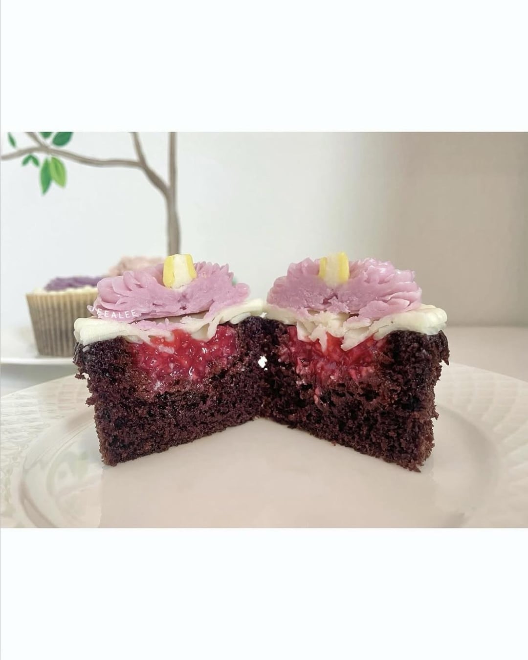 They are chocolate cupcakes with vanilla Italian meringue buttercream flowers/bees and raspberry compote filling.