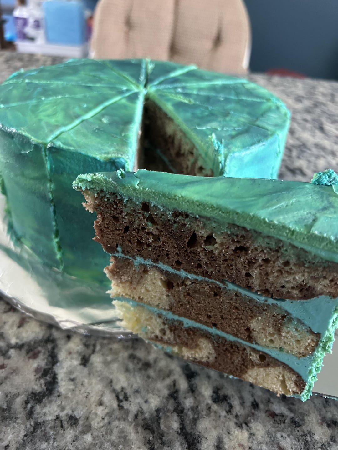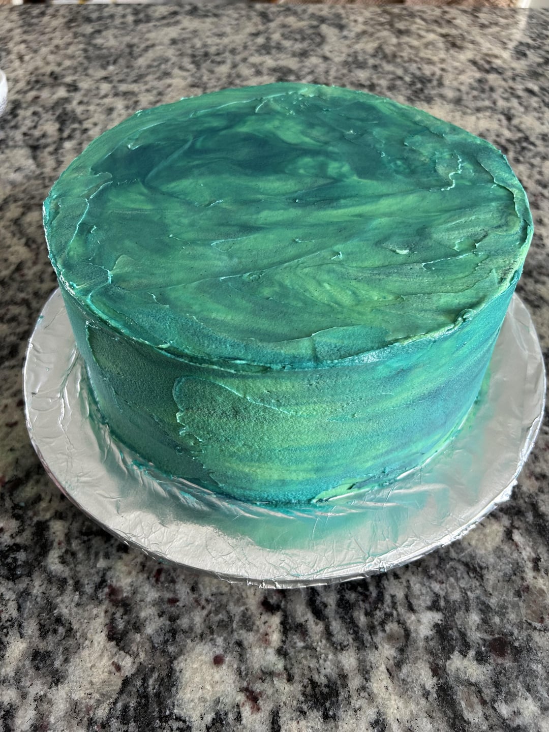 It’s a marble cake with a vanilla Russian buttercream. (The colours were picked out by my child- he was helping me make a birthday cake) I figured if the inside is marbled why not do the outside too.