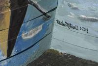 Artist Nadine Mitchell kept the signature by the original muralist Shirley Wallace, who painted it in 1994, when she repainted La Botte Italian Restaurant recently.