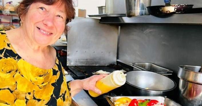Artist Nadine Mitchell peeks through a kitchen window into the hallway she painted at La Botte Italian Restaurant.