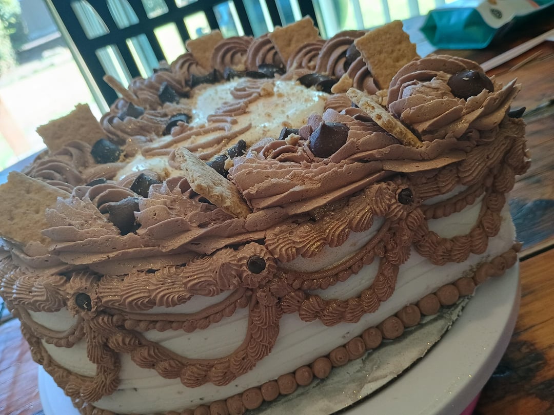 Good job! I think it looks good, the only note I’d give you is if you already have something like cracker pieces on the boarder I usually stray away from adding sprinkle crumbs or anything like that just because it can blend the entire cake and almost make it look like the same color or a little busy! I learned this from using sprinkles when I was beginning to decorate cakes! For example, I had a bordered cake like yours with sprinkles layered in the center and then I added small pinches of sprinkles on top of the border and it ended up looking a bit busy.