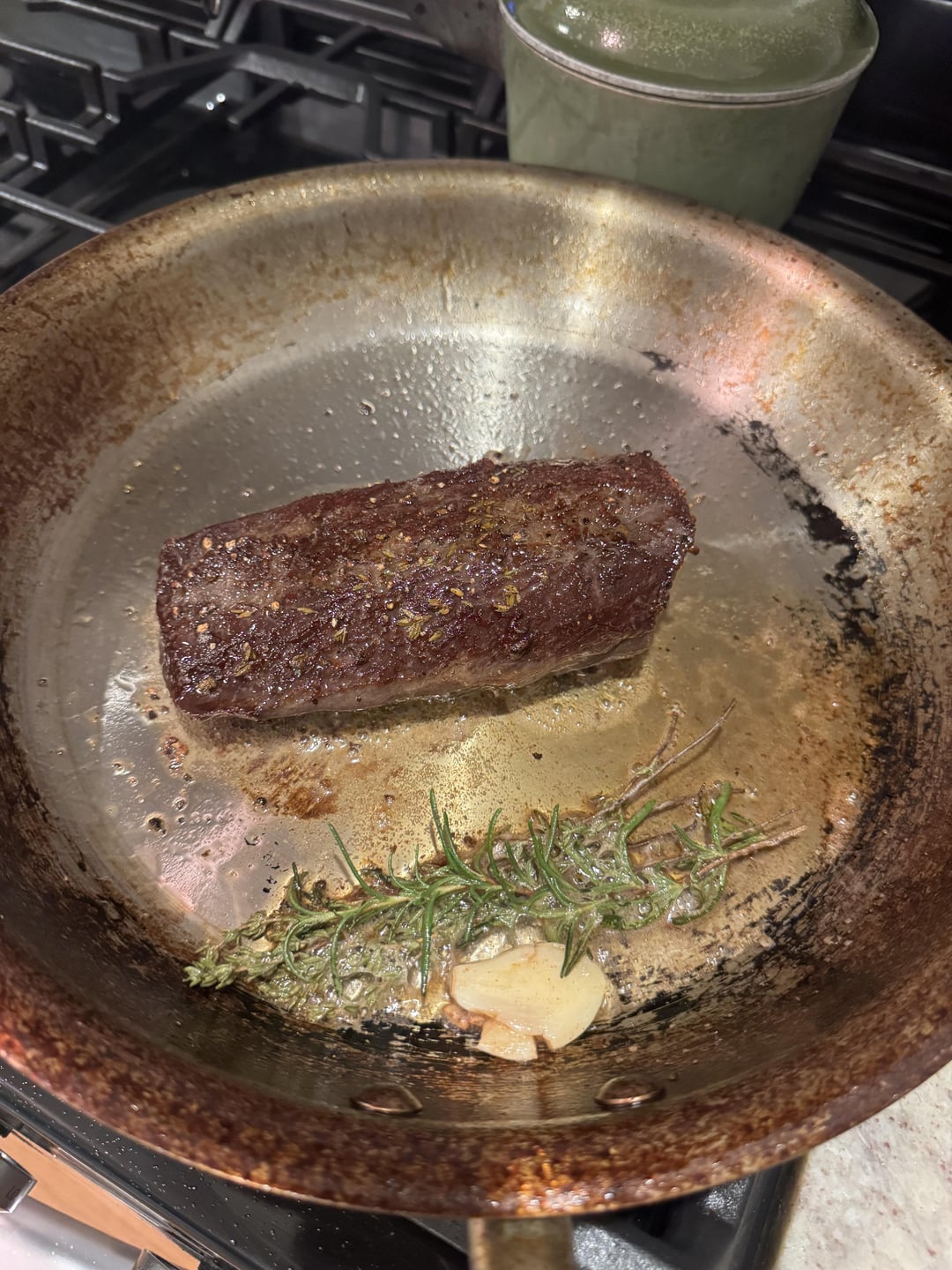 129° for two hours, ice bath, 90 second sear per side. Let it rest while I made the sauce. Almost caught the kitchen on fire with the flambé. 10/10 so good 👌