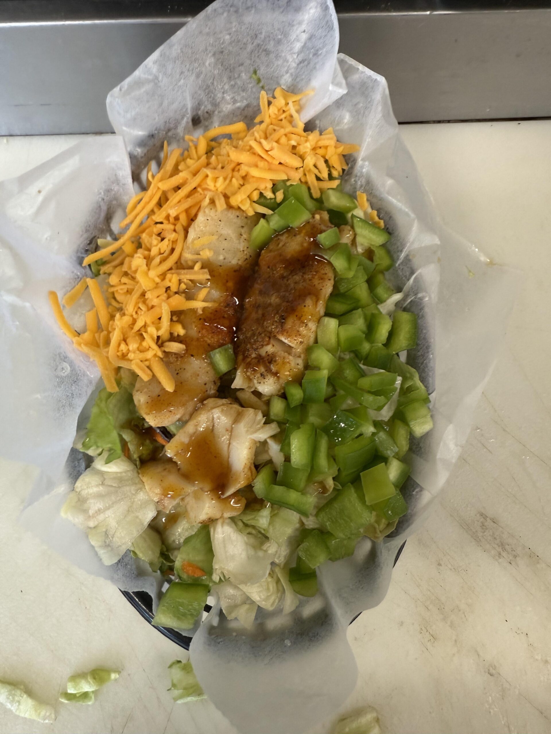Cod, (seasoned with paprika, garlic salt, and black pepper) green pepper, salad mix, and a little cheddar cheese topped with balsamic vinegar and a honey garlic (I need the extra sugar)