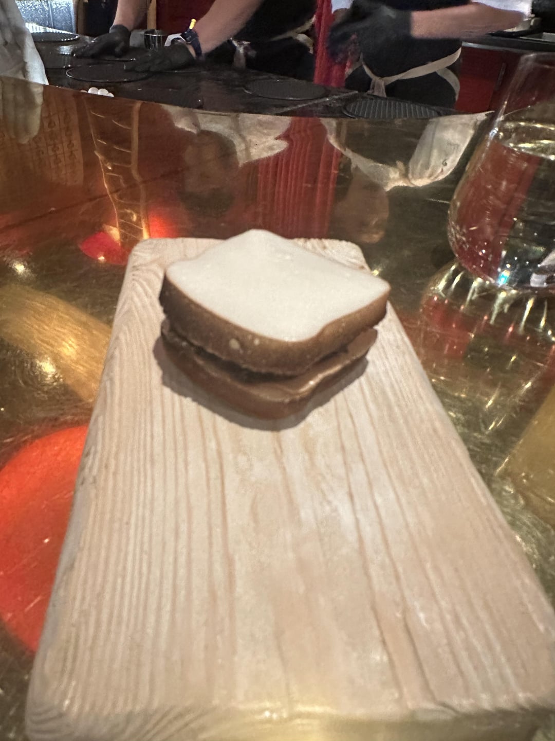 -little sandwich. This was actually foie mousse, truffle slices and sliced peaches between slices of bread that were actually meringue made with apple foam. Fun to eat.