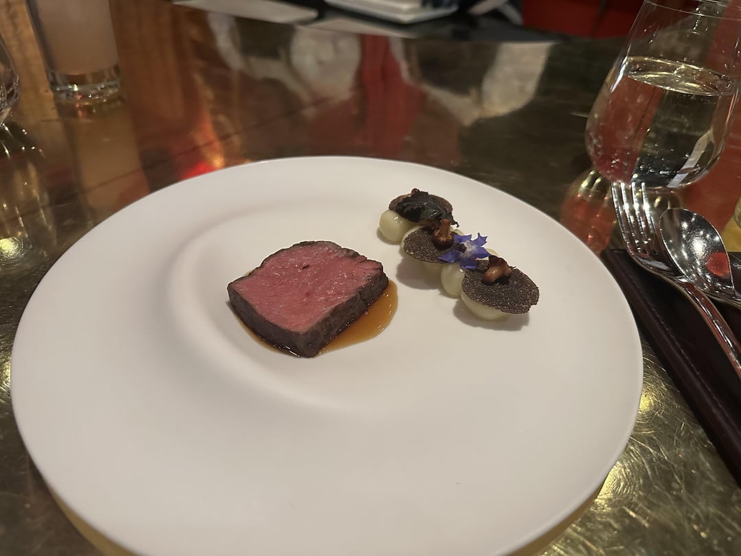 -wagyu striploin with spherical gnocchi. Spherical gnocchi, how fucking cool. Served with impossibly tiny chanterelles. I asked if they received an order of chanterelles this small and the chefs told me that their mushroom purveyor lets them pick over cases for the tiniest.