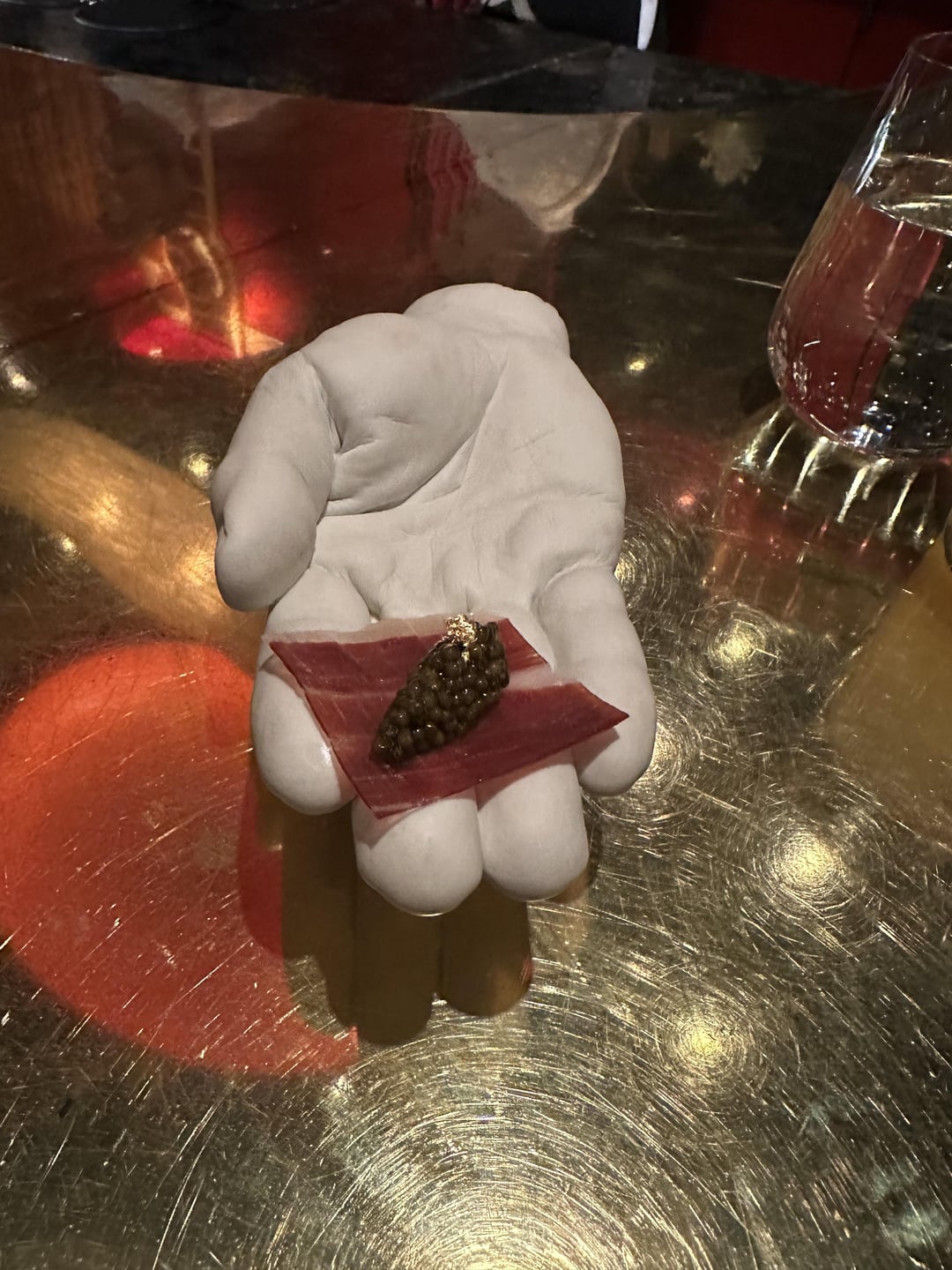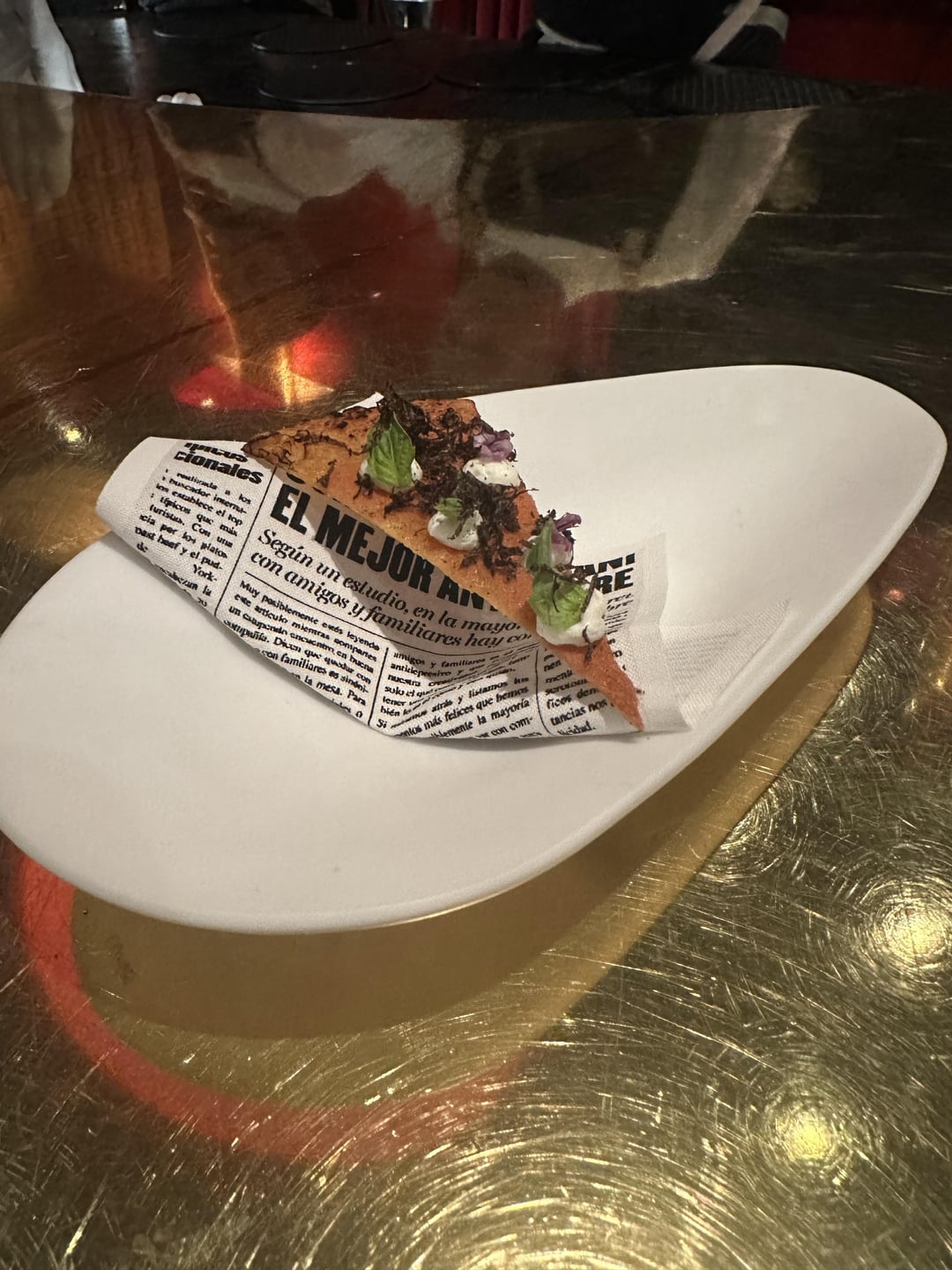 The first half or so of the meal was rapid fire finger food items. Much of this food tasted like or represented traditional Spanish flavors and dishes. We were served “pan con tomate” which was a crisp bubbled cracker filled with tomato espuma and topped with jamon iberico. Was it traditional? Not exactly but it tasted familiar which was cool and comforting.