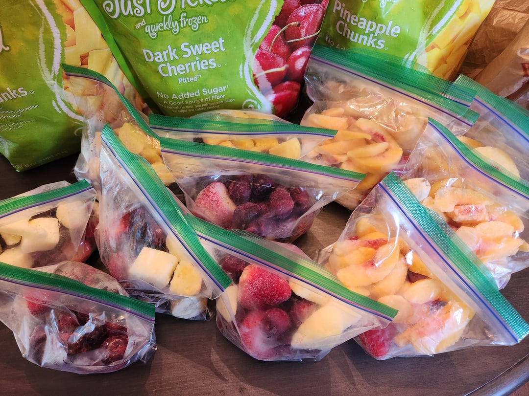 The mix varies from bag to bag keeping things interesting. Half a banana in each (I don't care for the taste of them but like the smooth texture and vitamins they give). 4-ish large strawberries, and half a cup of either cherries, mango, peaches or pineapple.