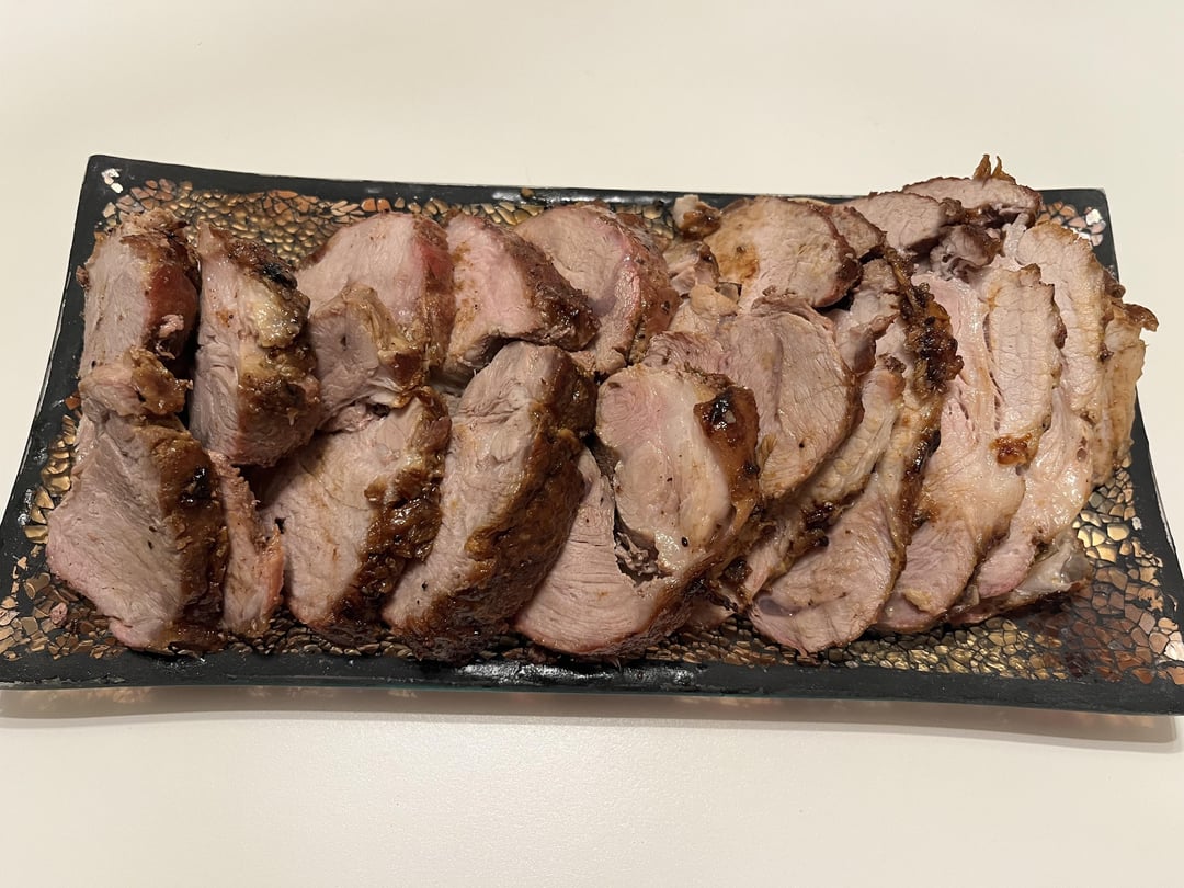 I mixed mustard and brown sugar (I ran out of maple syrup), and then brushed it after seared.Baked at 390F until 140F inside (around 1hr).