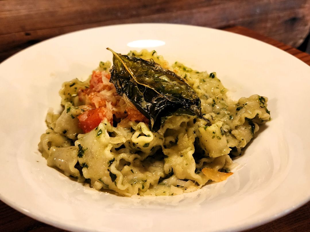 Rainbow Lodge’s Mafalda pasta ribbons with summer basil pesto, roasted tomatoes, and Parmesan.