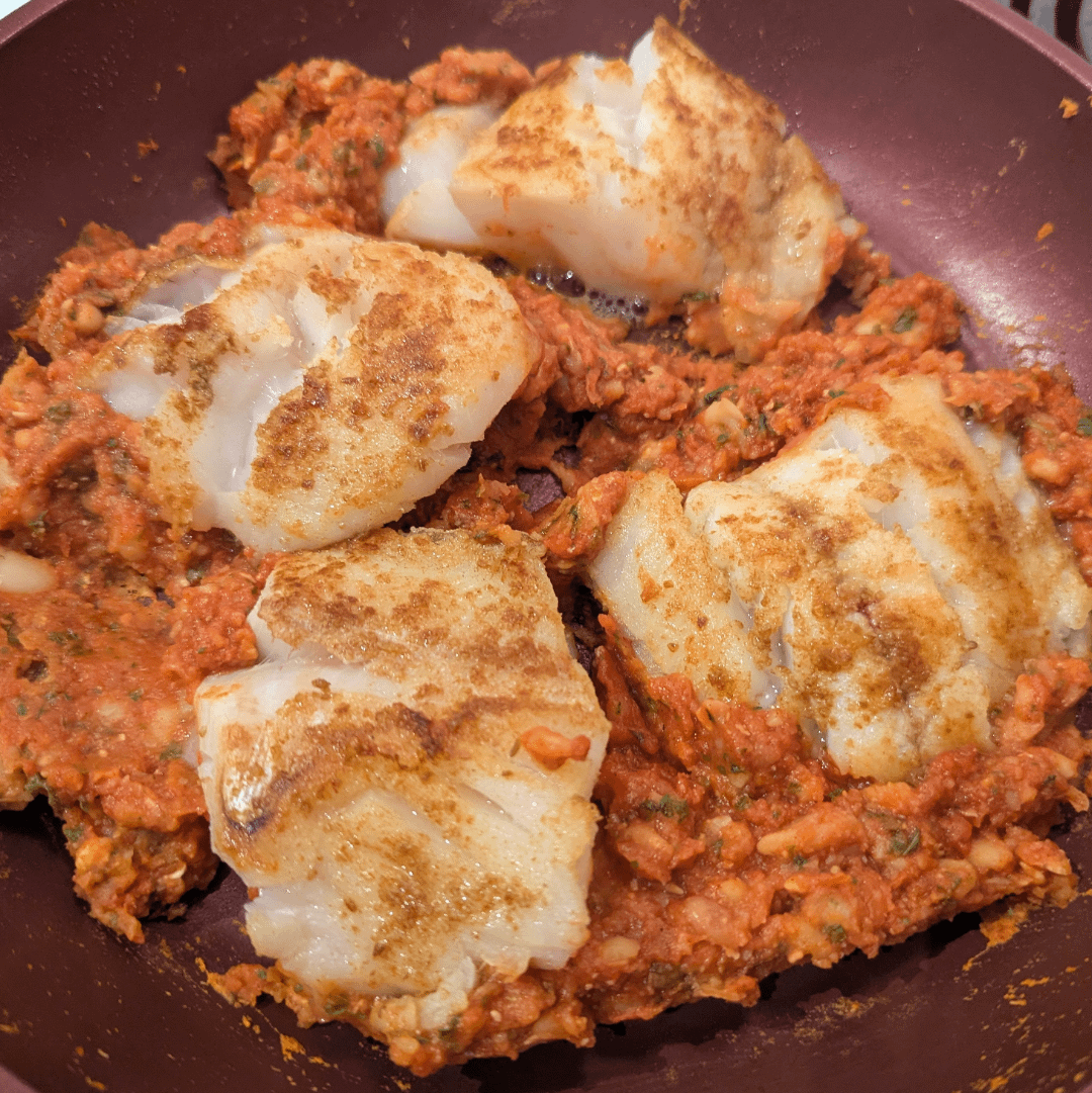 Pan grilled merou sprinkled with olive oil and cumin, then added the shakshuka mix (tomatoes, white beans, coriander, paprika, cumin, fresh parsley and a bit of sheep feta). Served with whole grains and green beans.