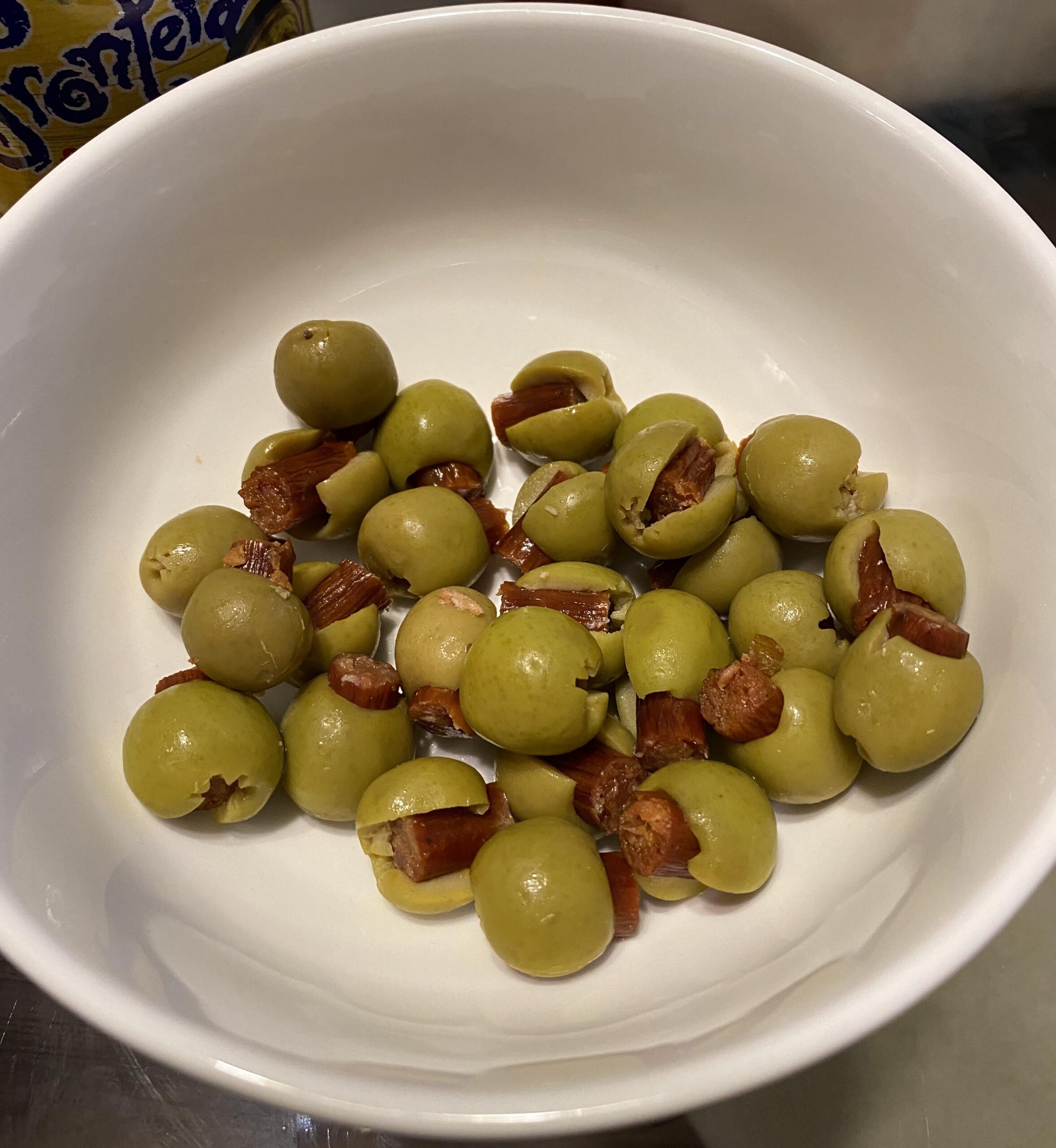 My cat would have cleared the bowl. He LOVES olives and wishes he could try meat sticks.