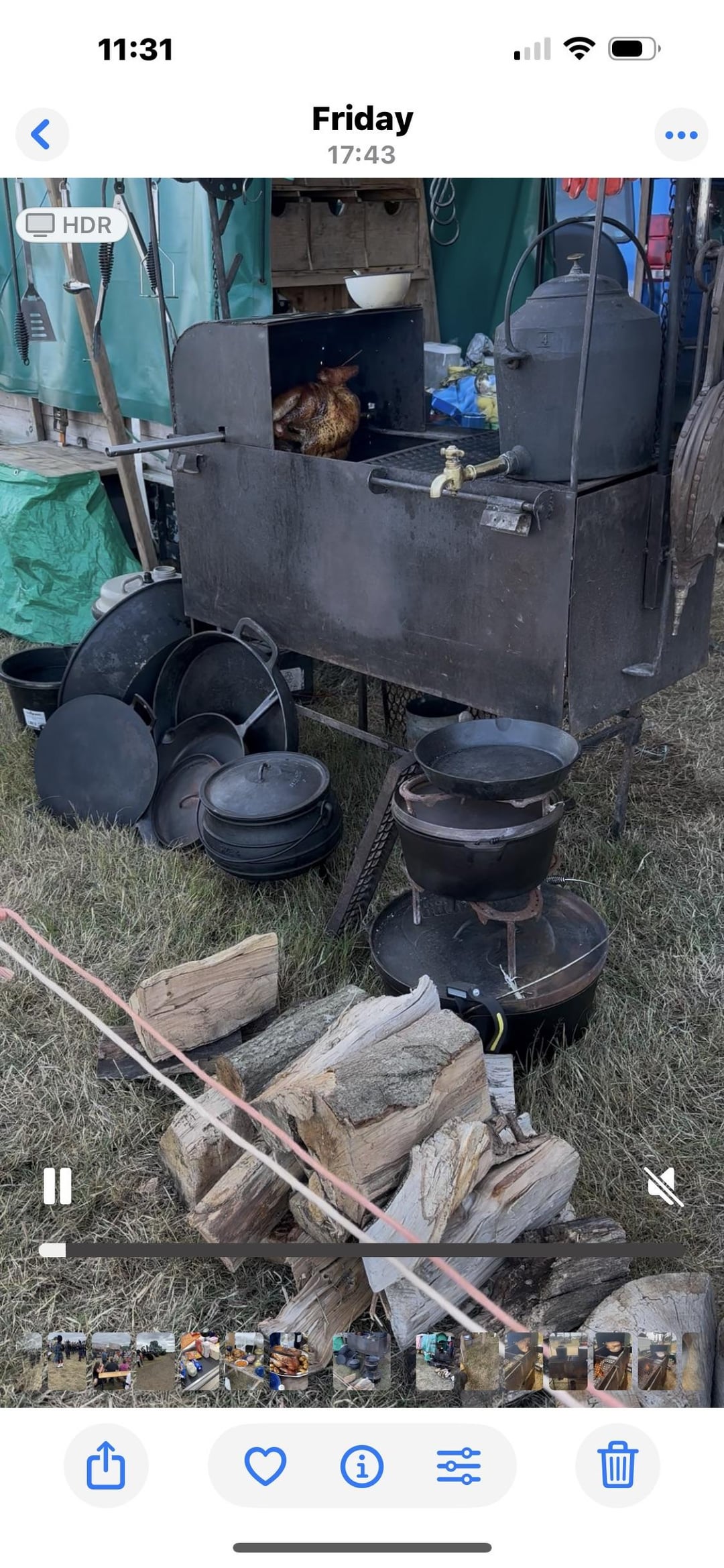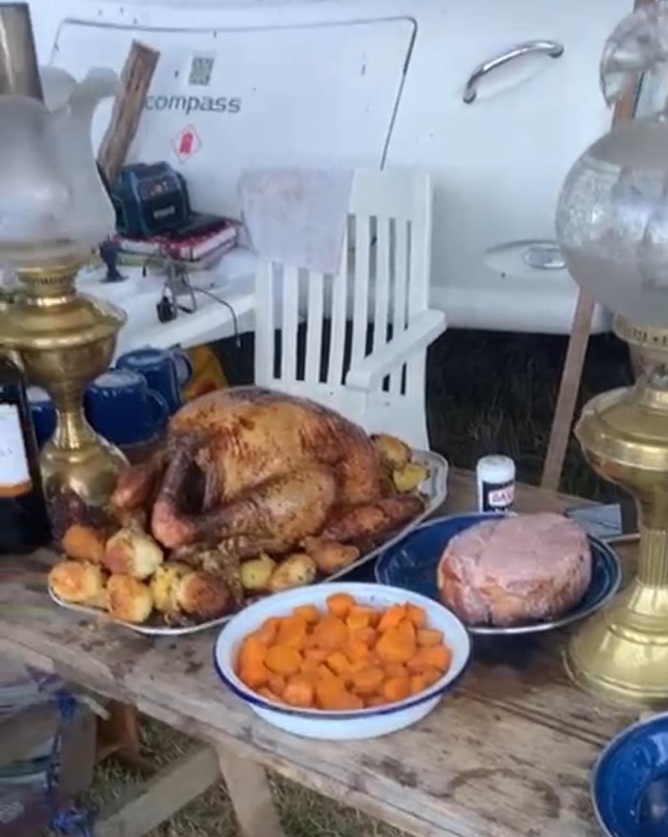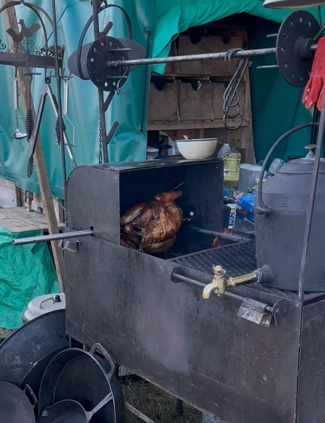 Turkey cooked for nearly seven hours on a rotisserie. Roasties par boiled and cooked with stuffing in the 20 inch Dutch oven. Ham boiled with onions carrots and bay leaves. Gentle offset wood fire so the turkey doesn’t burn. Cooked beautifully and fed some hungry workers. Went down really well and fed us the next day too.
