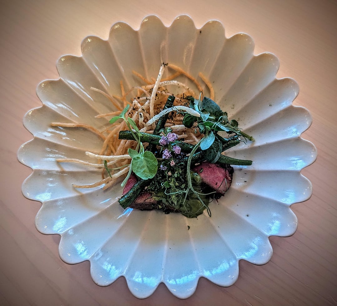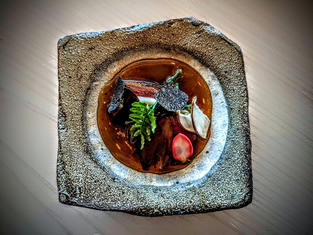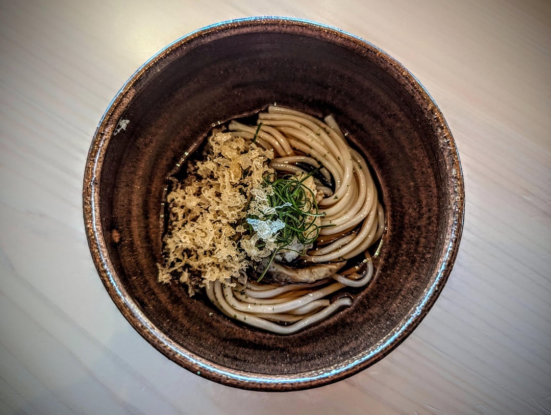 Other dishes were very good but did not hit quite the same 'sit back and luxuriate' heights. These included first the Business Card, consisting of a mixture of chutoro and otoro (coming from Portuguese Bluefin), wrapped in crispy nori (two varieties, one of which comes from Tokyo bay) and topped with N25 Kaluga caviar (chosen to enhance the tuna's creaminess, and not particularly for salinity). In addition, the Gloucestershire Egg 'carbonara' was a lot of fun, where otoro was mixed with egg yolk, enoki mushrooms, cordyceps mushrooms, Australian truffles and the world-class cress that can only be found in Acton Town. Creamy but texturally varied due to the mushrooms and crispy kale, the second iteration came when – after only a little bit of the sauce remained – some sushi rice was added for a final decadent (and slightly dessert-like) mouthful. The cold udon noodles with spider crab from Devon were deliciously refreshing, while the A5 Wagyu from Miyazaki prefecture was a fitting end to the savoury courses; melt-in-the-mouth tender, it really could have been left alone, but with the asparagus and potato mousse, it was a condensed main course in and of itself.