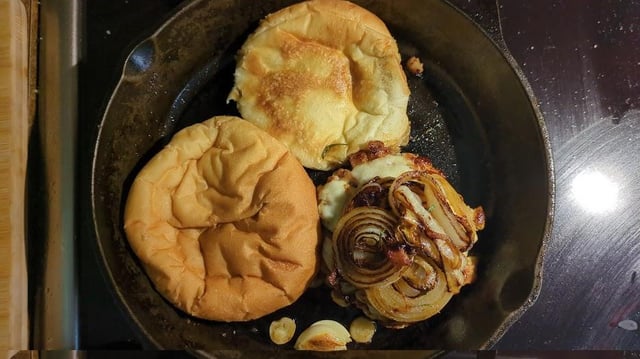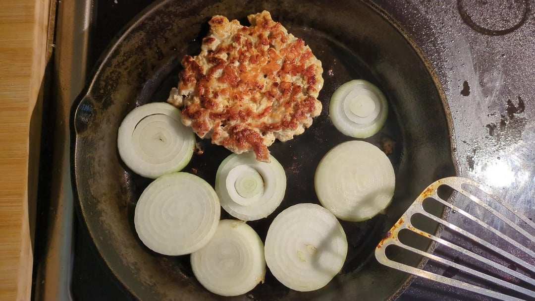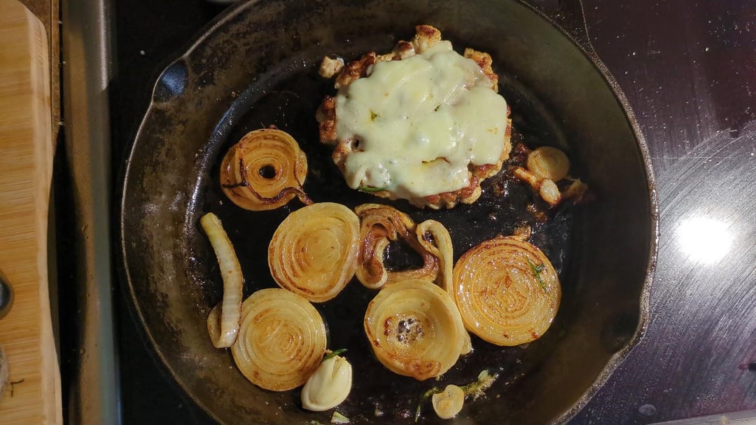 Pork chops were on sale, so I decided to chop them up to a pretty coarse ground meat (chopped pork chops?). Grilled them up with some onions, let the onions sit in some butter with rosemary / thyme / garlic and then added some gouda on the burger and a bit of chicken stock to let the cheese melt a bit and stew the onions a bit.