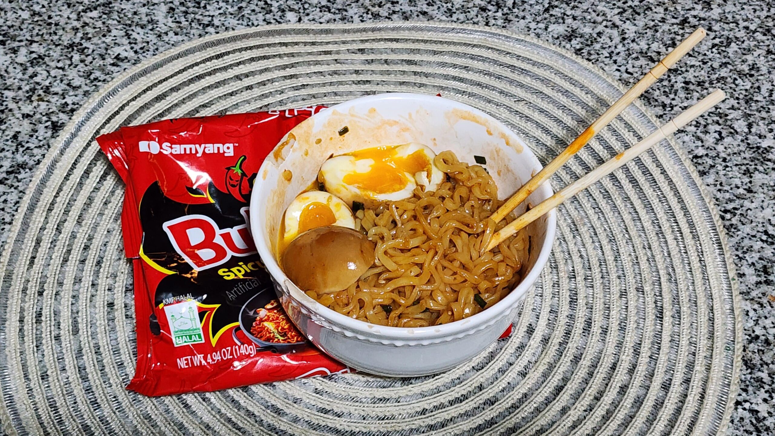 It's Buldag x2 spicy chicken ramen, with two soft boiled eggs marinated in soy sauce/sugar/water/garlic, and a touch of ciboulette.