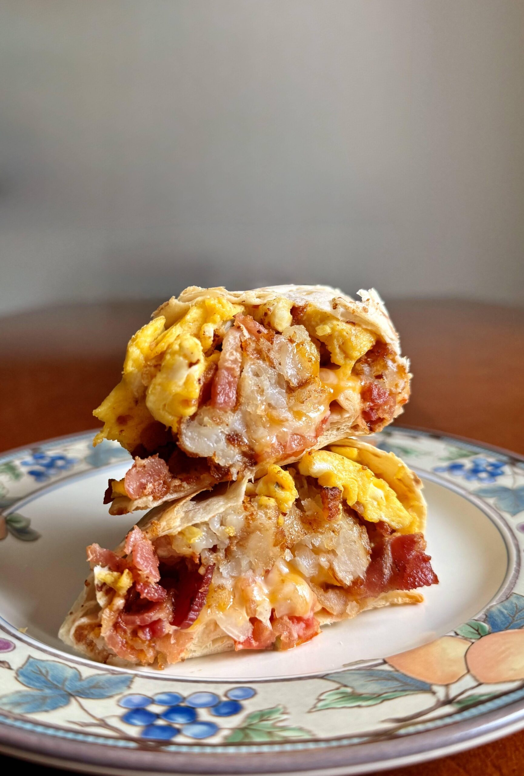Each burrito gets eggs, bacon, hash brown, cheese and pico de gallo. Wrap and cut on the diagonal. The one I eat today gets baked for 6-7 minutes to make it ooey-gooey.